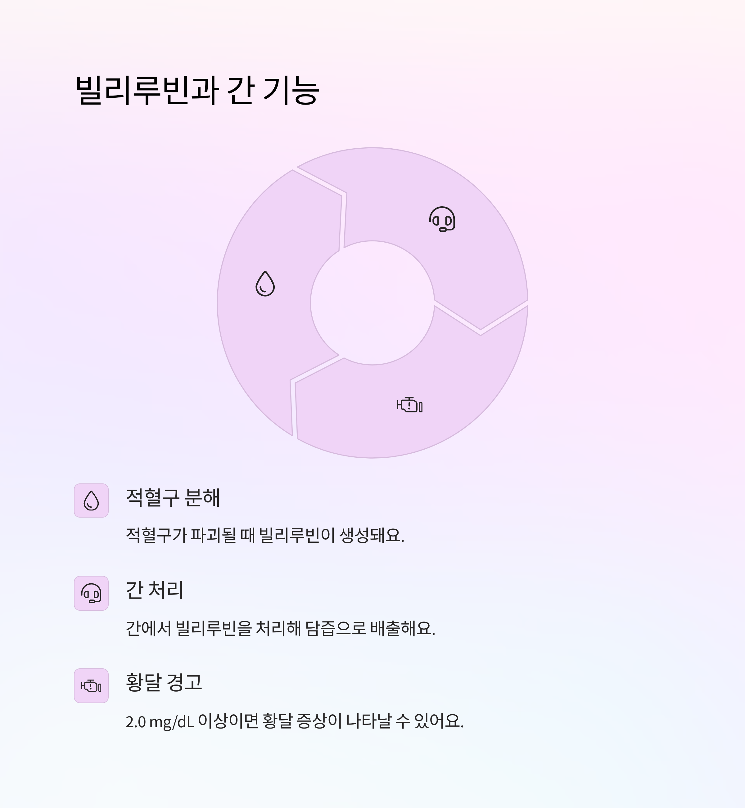 빌리루빈은 우리 몸의 적혈구가 파괴될 때 나오는 물질이에요. 간에서는 이 빌리루빈을 처리해서 담즙으로 배출하는데, 간에 문제가 생기면 이 과정이 원활하지 않아 혈중 빌리루빈 수치가 높아져요. 바로 이 빌리루빈 수치로 간의 해독 능력을 확인할 수 있는 거예요.