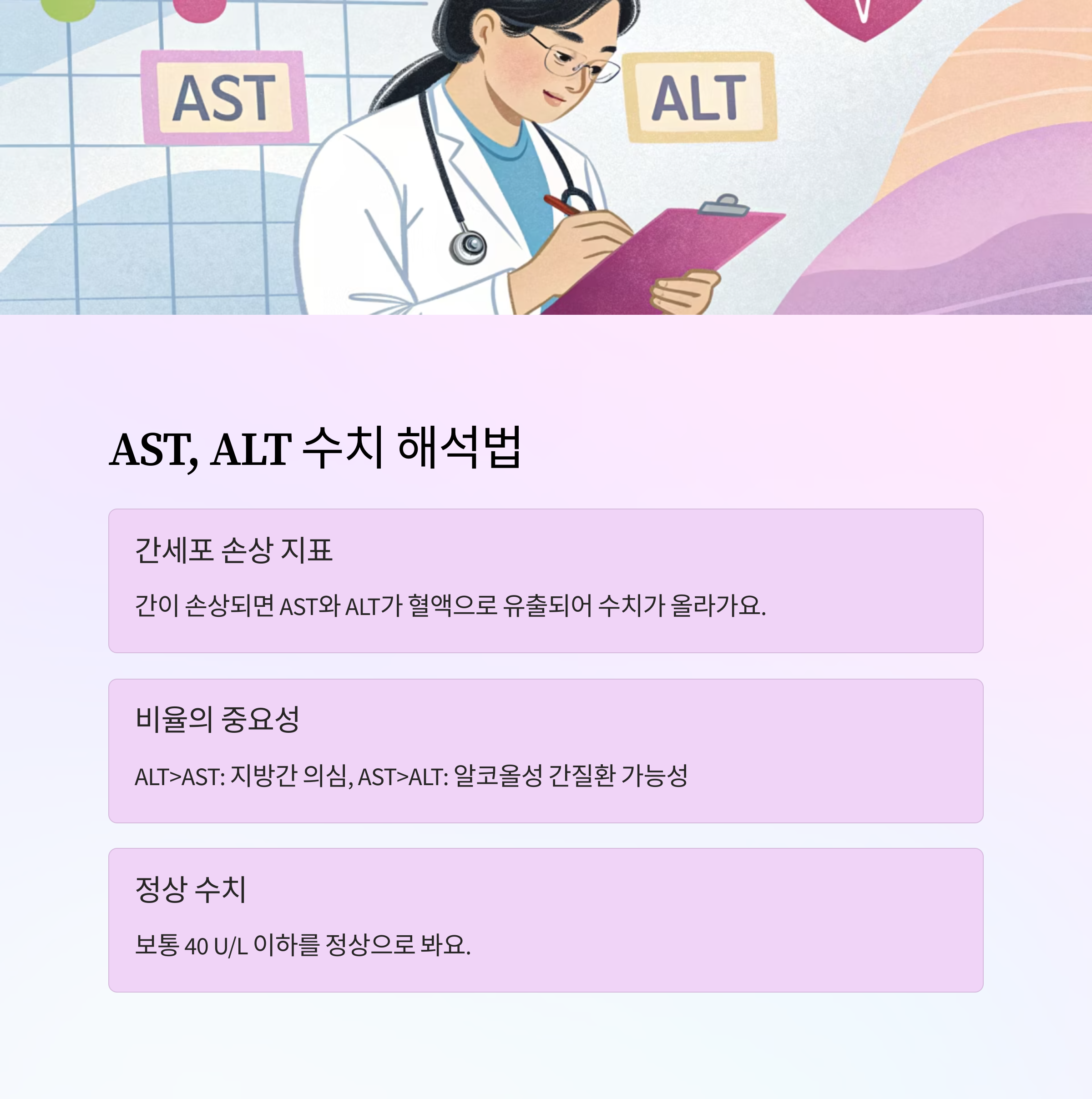 이 표를 참고하면 간단히 어떤 수치가 무엇을 의미하는지 파악할 수 있어요. 앞으로 나올 섹션에서 AST, ALT, γ-GTP 등 각각의 항목을 좀 더 깊이 있게 살펴볼 거예요! 😊