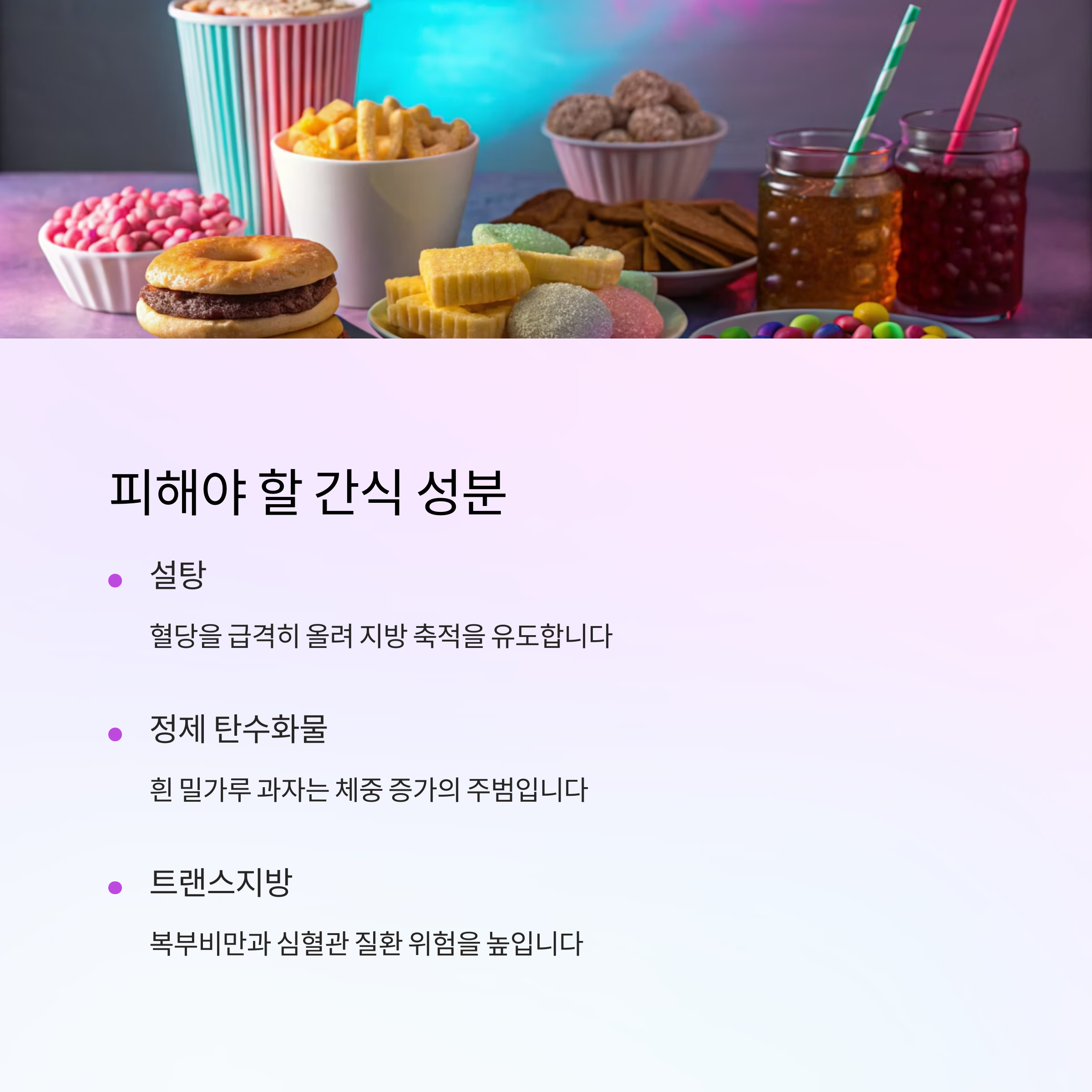 갱년기 간식을 고를 때, 영양소만큼이나 중요한 건 ‘피해야 할 성분’을 아는 거예요. 우리가 흔히 접하는 시판 간식에는 체중 증가를 부추기는 성분이 숨어 있는 경우가 많답니다. 특히 설탕, 정제 탄수화물, 트랜스지방, 인공감미료는 조심해야 해요.
