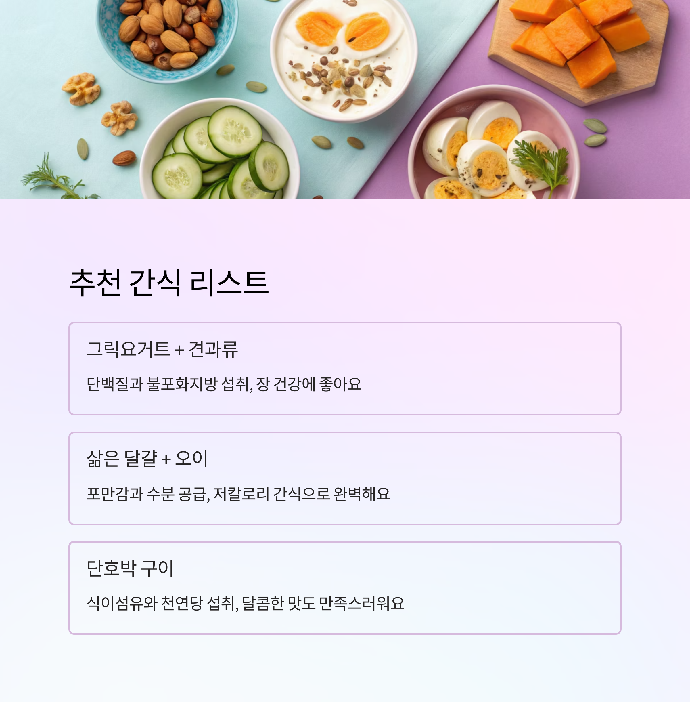 | 삶은 달걀 + 오이 | 포만감, 수분 | 점심 전후 간식 |