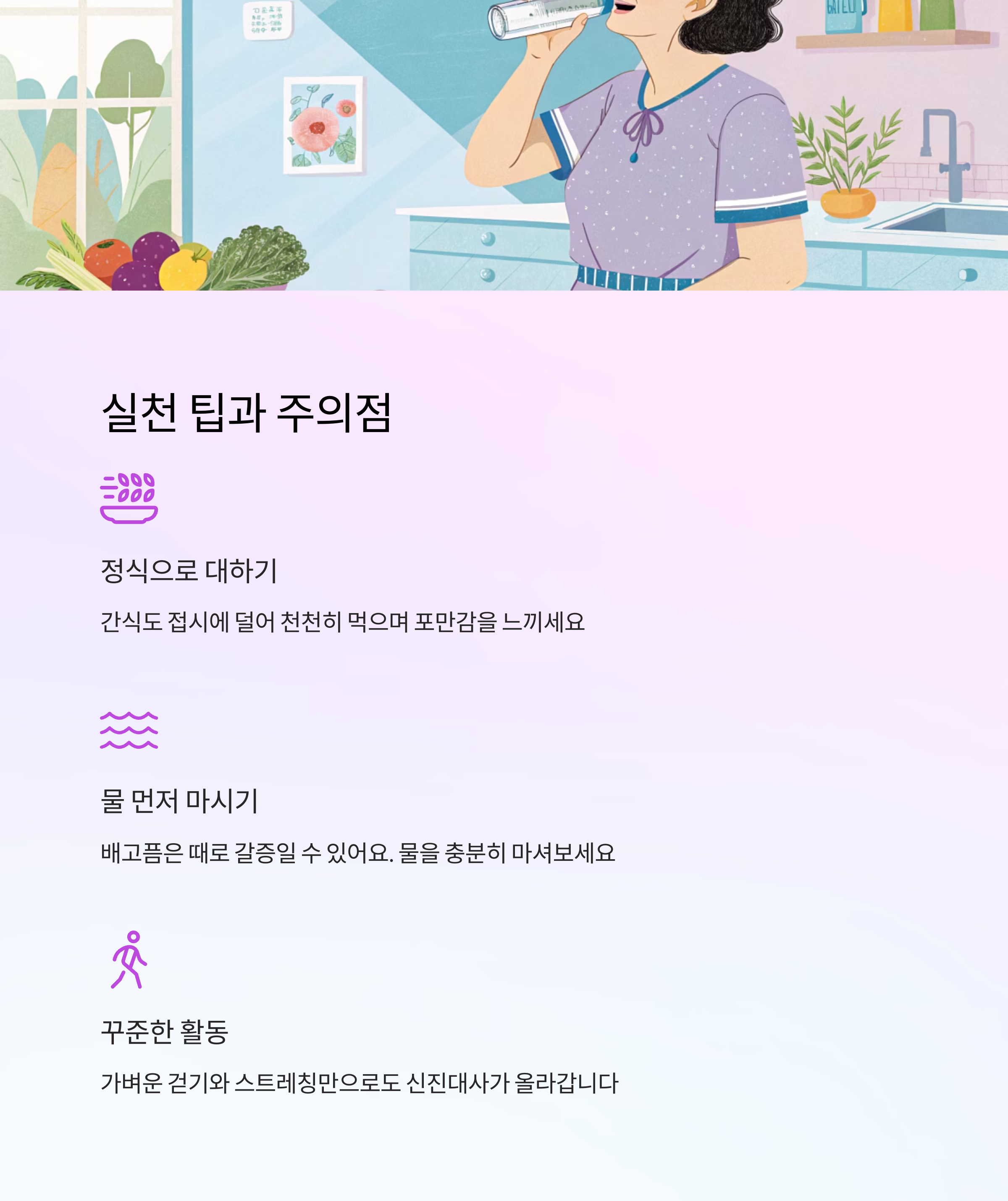 첫 번째 팁은 식사처럼 간식을 대하는 습관이에요. 접시에 덜어 천천히 먹고, 포만감을 느끼는 시간을 주는 거죠. 두 번째는 물 많이 마시기! 종종 배고픔으로 착각되는 갈증이 있을 수 있으니 물을 먼저 마셔보는 것도 좋아요.