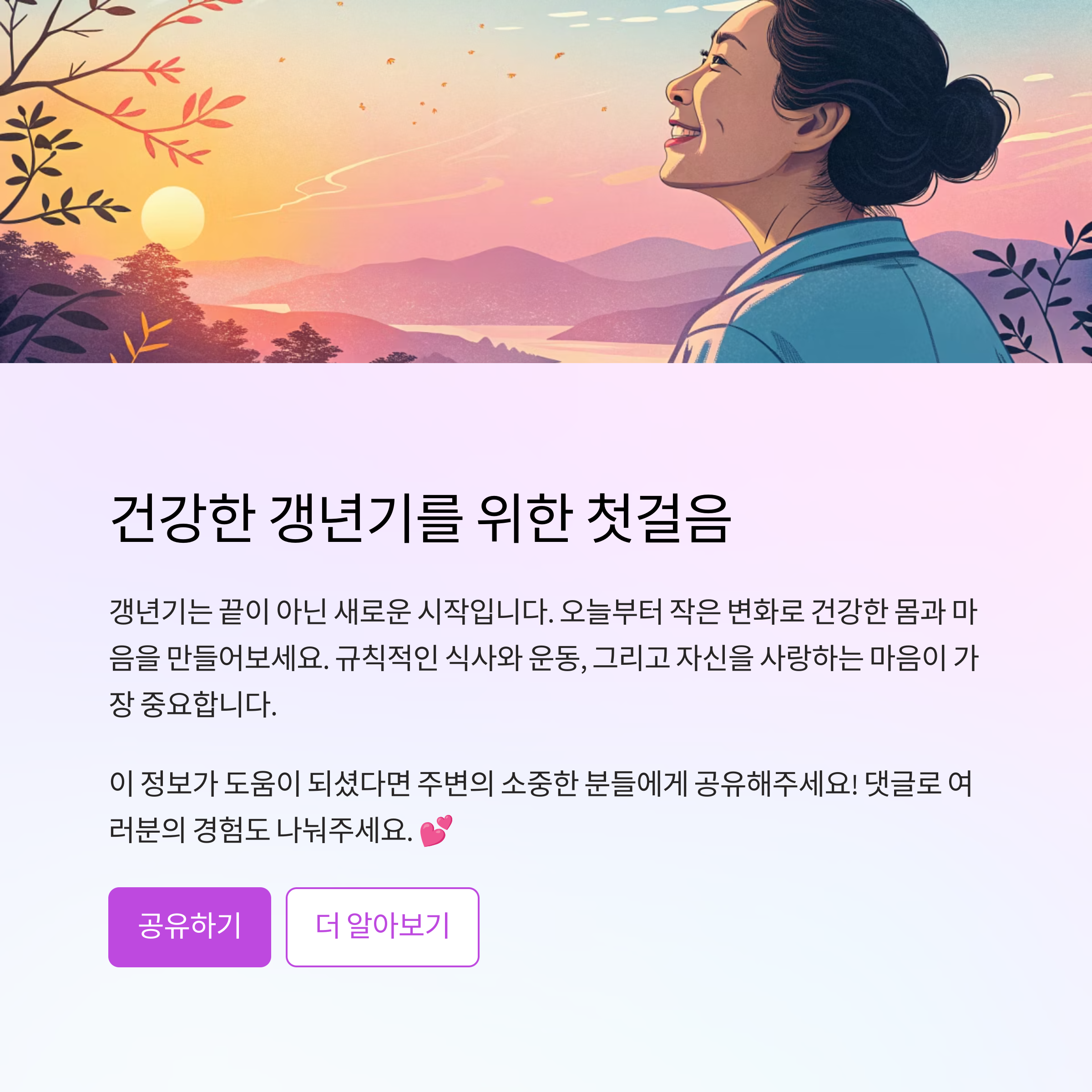 갱년기 다이어트는 단순히 살을 빼는 목적을 넘어서요. 결국은 건강하게 오래 살기 위한 과정이에요. 나를 소중히 여기고, 지금부터라도 조금씩 바꿔보는 걸 추천해요!