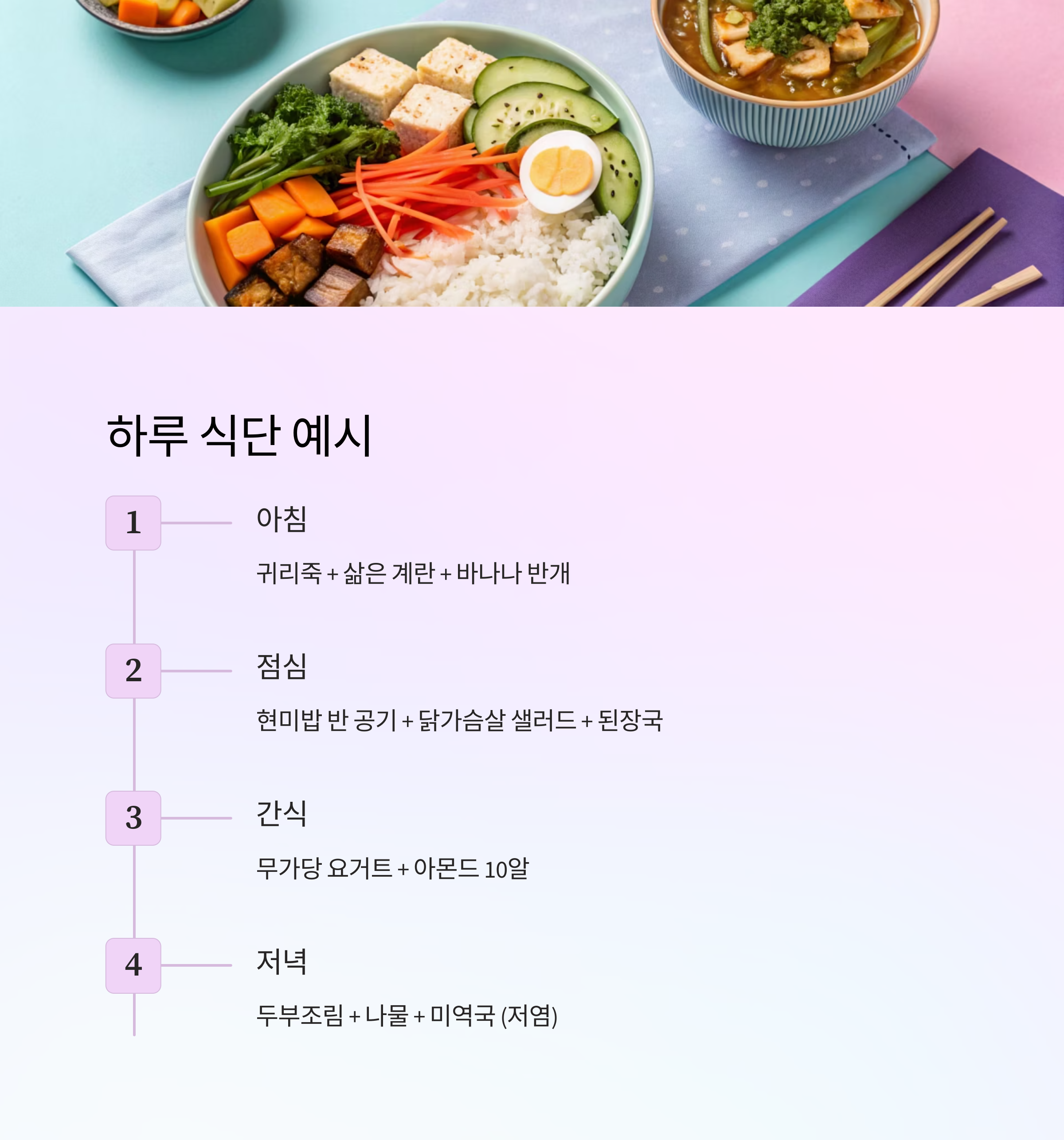 | 저녁 | 두부조림 + 나물 + 미역국 | 저염 & 고단백 |