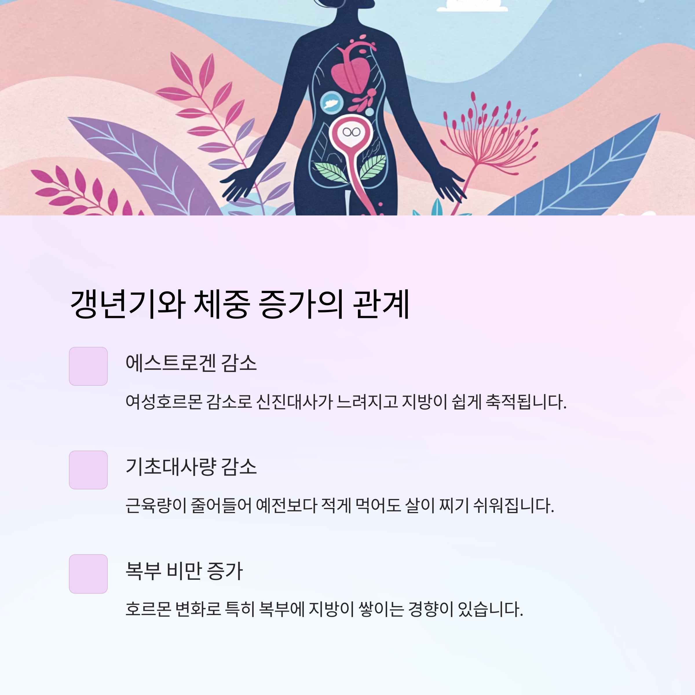 | 호르몬 감소 | 에스트로겐 수치 저하 | 지방 축적 증가 |