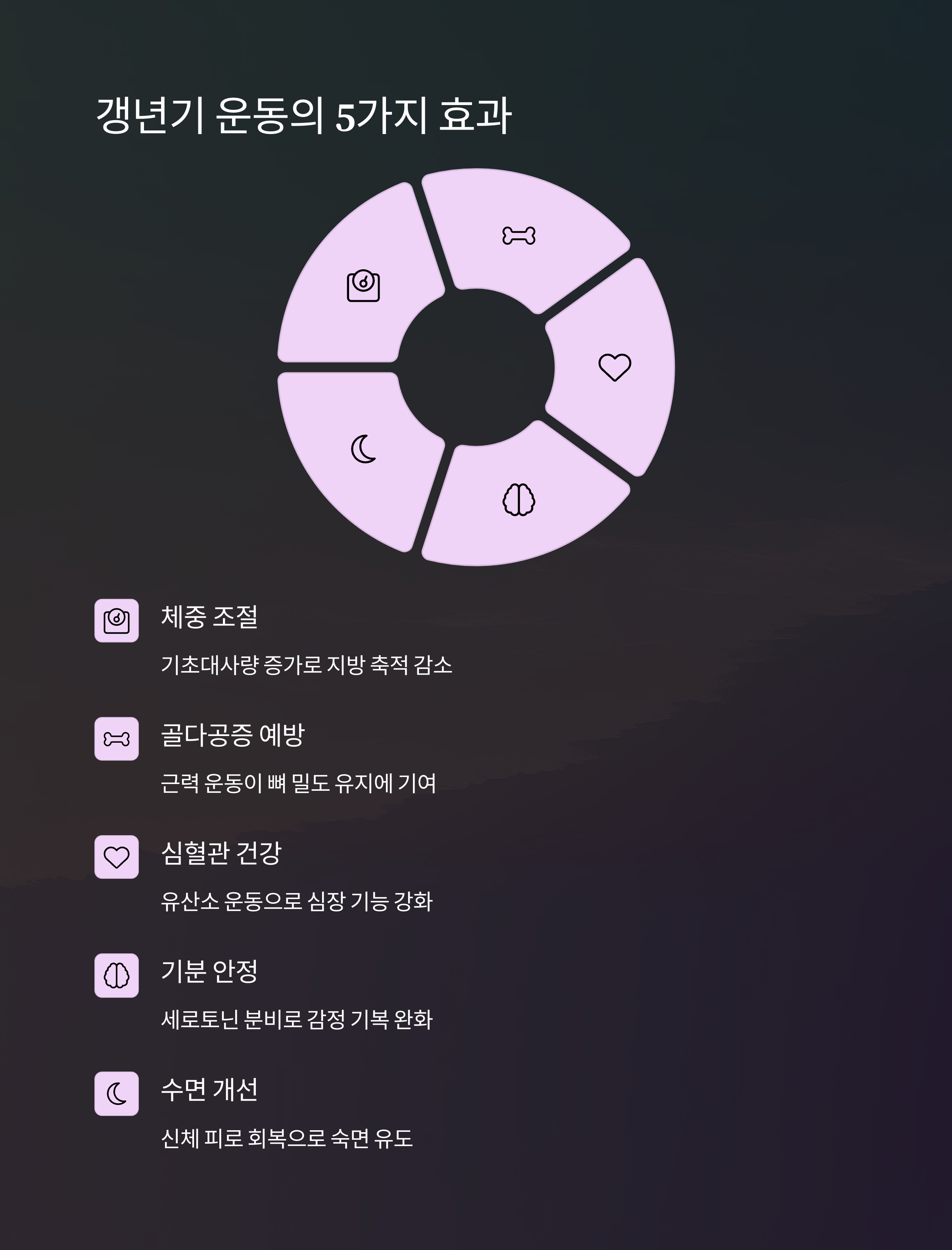 게다가 심리적인 요인도 있어요. 갱년기에는 우울감이나 불안감이 동반될 수 있고, 이로 인해 활동량이 줄어들면서 악순환이 생기기 쉬워요. 따라서 운동은 단지 몸을 위한 것이 아니라, 기분 전환과 활력 회복을 위한 도구이기도 하답니다.