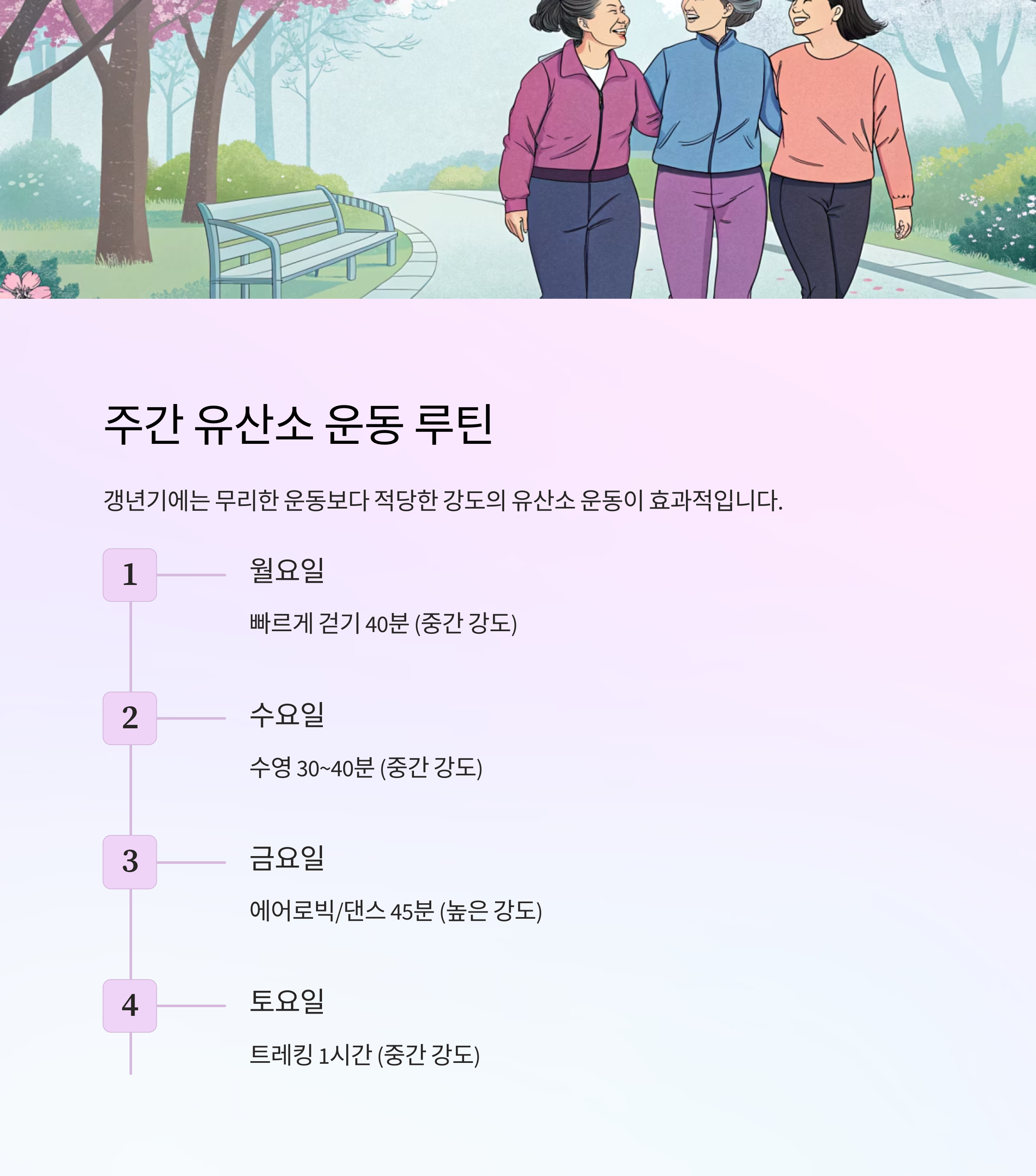 내가 생각했을 때, 갱년기 운동의 핵심은 ‘무리하지 않되 꾸준히’라는 점이에요. 젊을 때처럼 강도 높은 운동이 아니라, 나에게 맞는 리듬을 찾고 일상에 자연스럽게 녹아들 수 있는 루틴이 가장 중요하다고 느껴요. ✨