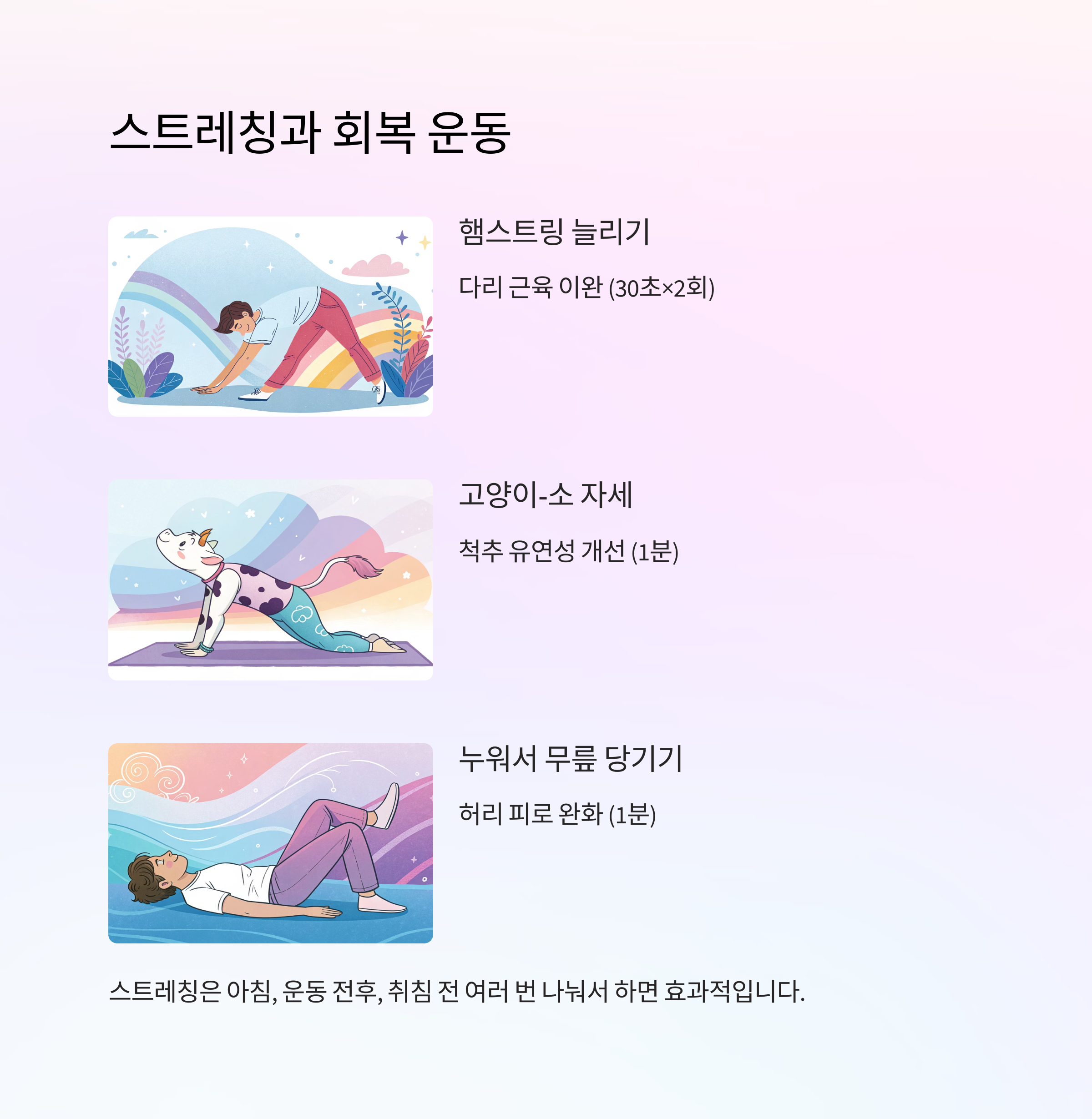 | 스트레칭 | 햄스트링 늘리기 | 30초 × 2회 | 다리 근육 이완 |
