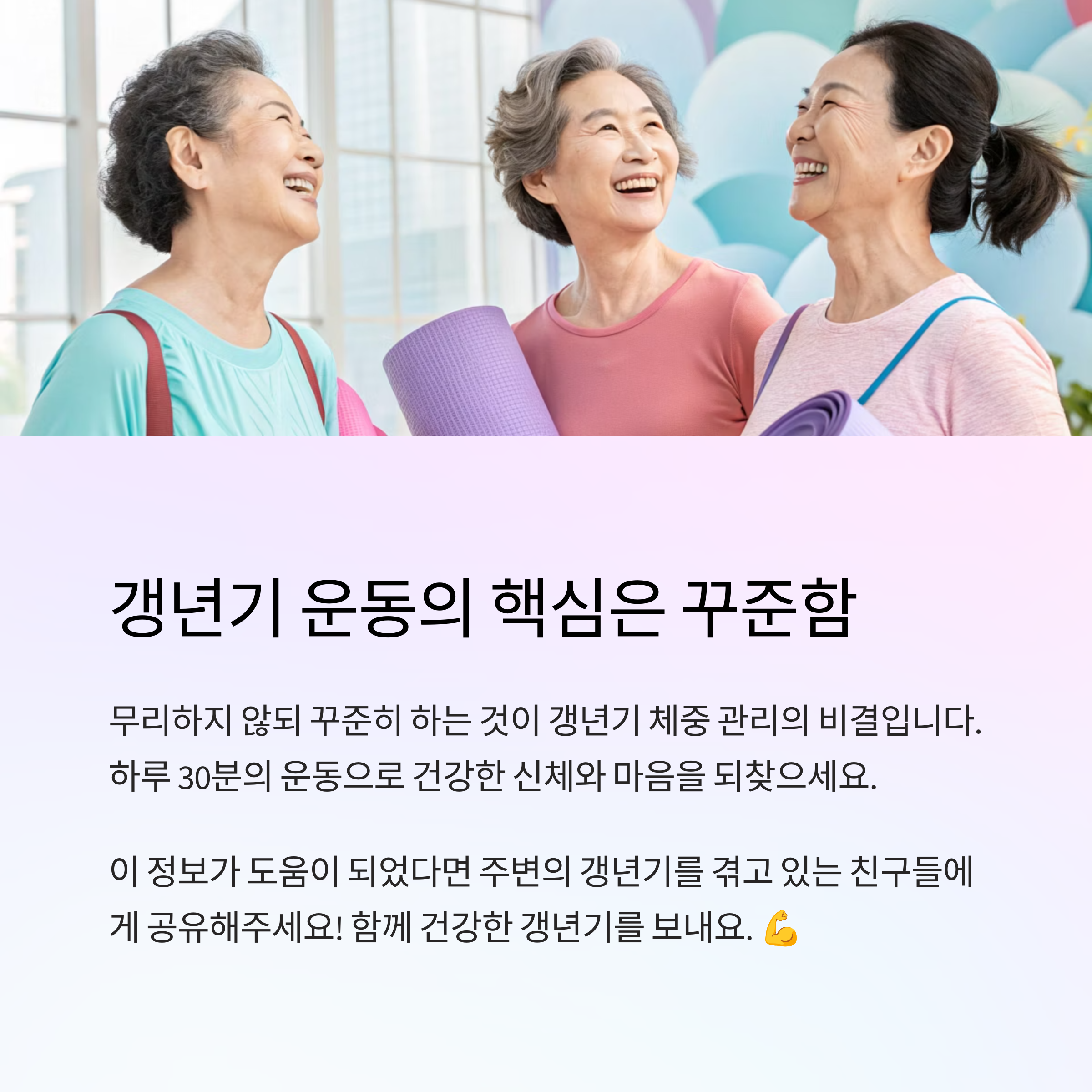 무엇보다 중요한 건 ‘운동을 생활화하는 자세’예요. 거창한 목표보다는 “매일 20분은 내 몸을 움직인다”라는 습관을 만드는 게 핵심이에요. 이렇게 실내외 운동을 자연스럽게 섞다 보면, 어느새 갱년기 체중 조절은 물론 활력까지 되찾게 될 거예요! 💖