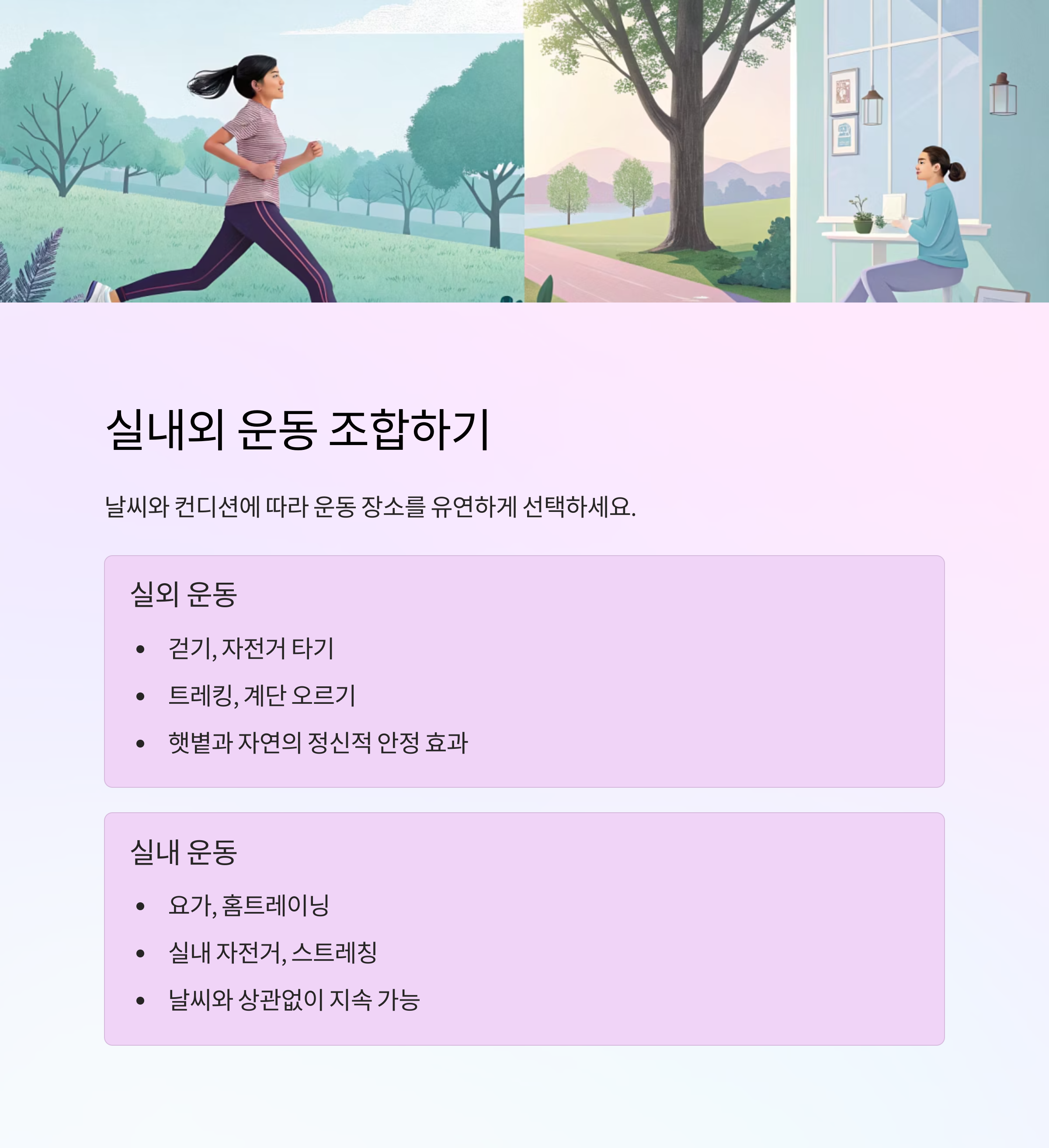 운동은 꾸준히 할수록 몸이 기억하고, 습관이 돼요. 실내 운동은 날씨에 구애받지 않고, 실외 운동은 스트레스를 날려줘요. 두 가지를 잘 섞어서 내 몸과 마음을 동시에 건강하게 만들어봐요. 😊