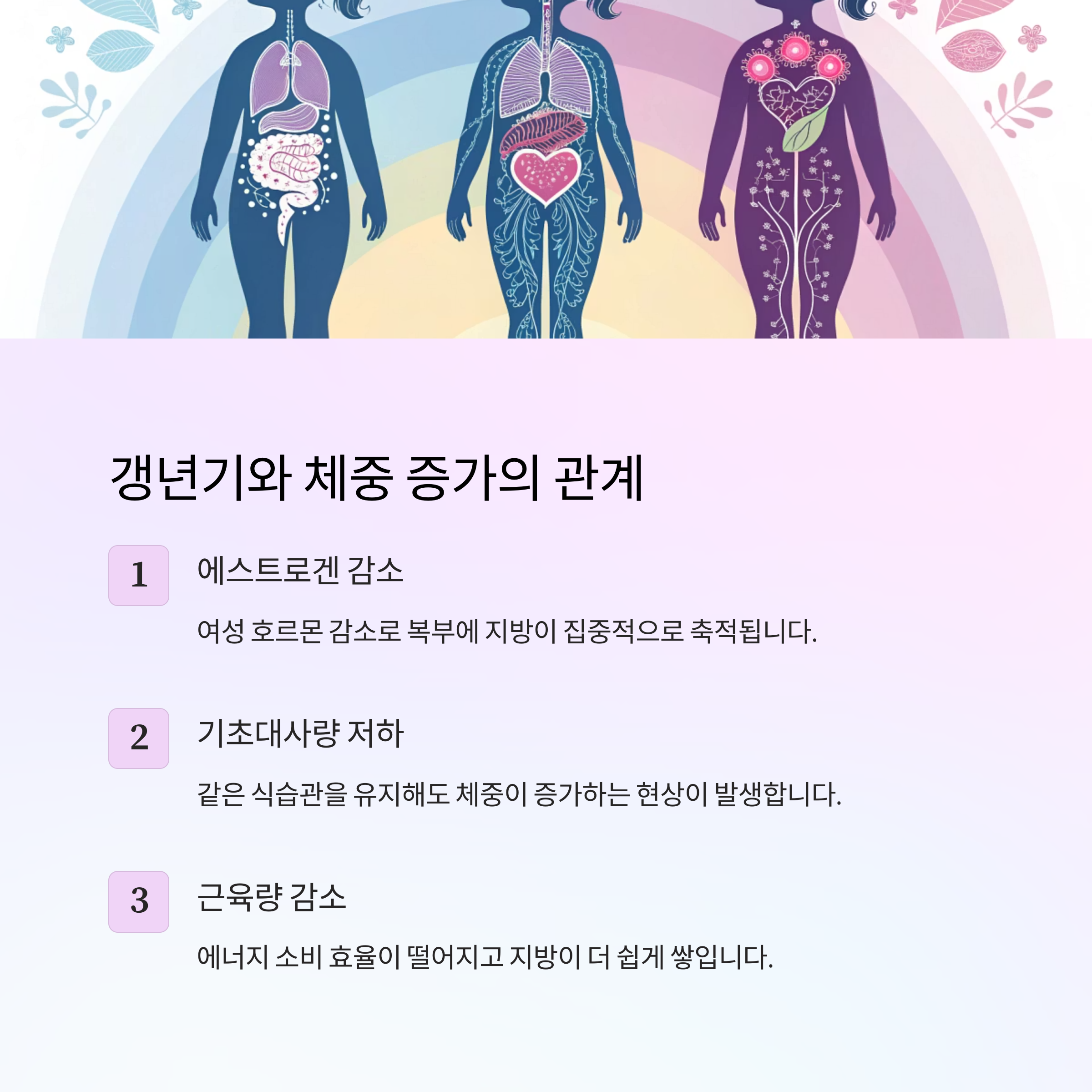 갱년기는 여성에게 신체적, 정신적으로 많은 변화가 일어나는 시기예요. 특히 여성 호르몬인 에스트로겐이 급격히 감소하면서 기초대사량이 낮아지고, 뱃살이 늘거나 쉽게 피로를 느끼게 되죠. 이로 인해 체중 증가와 운동 부족이 겹치면 건강에 악영향을 줄 수 있어요.
