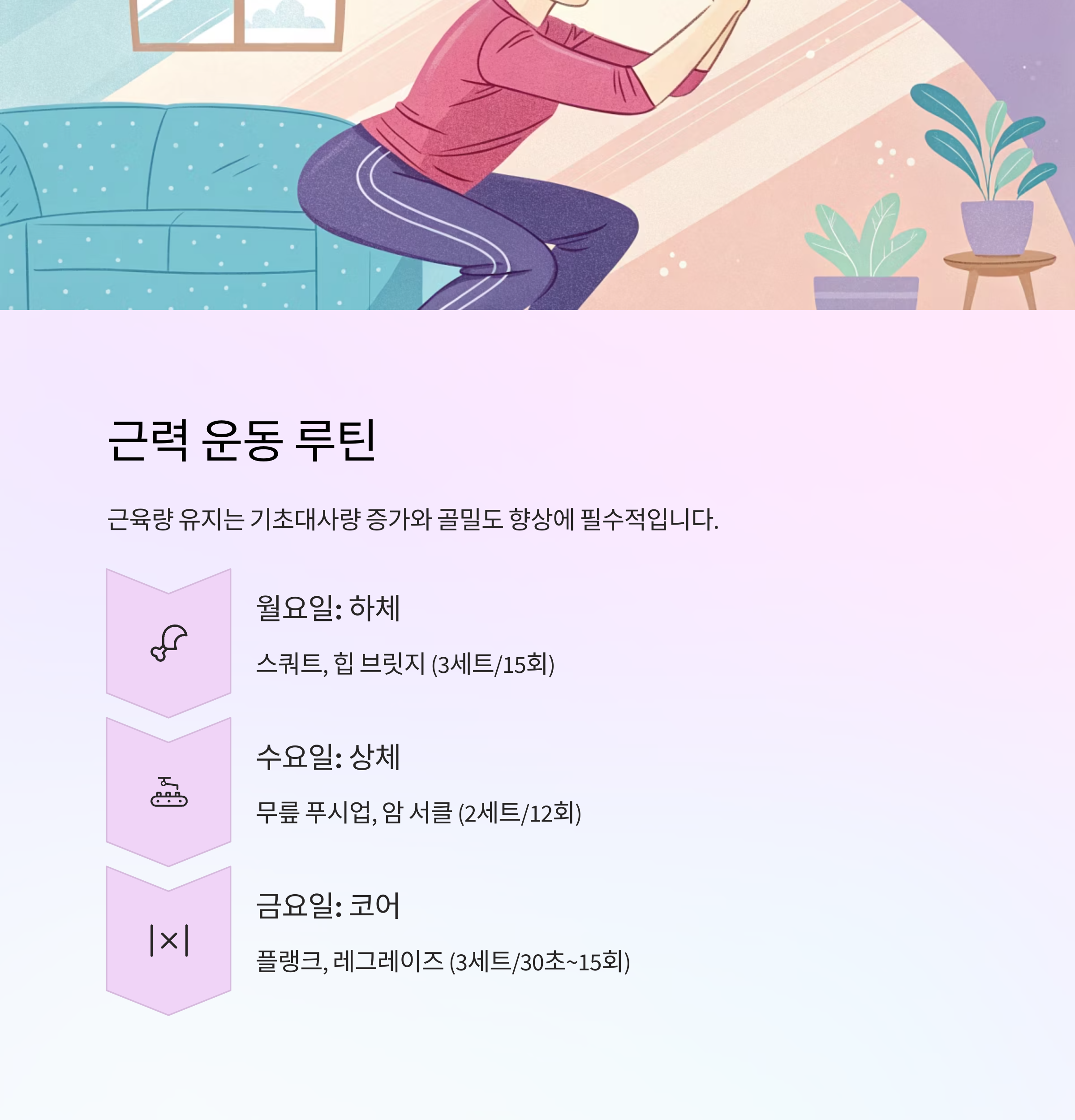 자, 그럼 본격적으로 갱년기 여성에게 맞는 주간 근력 운동 루틴을 소개할게요! 집에서도 할 수 있는 동작들로 구성했으니 누구나 따라 하기 쉬워요. 각 동작은 10~15회씩 2~3세트 반복해주면 좋고, 무리하지 않는 범위에서 천천히 횟수나 세트를 늘려가면 돼요.