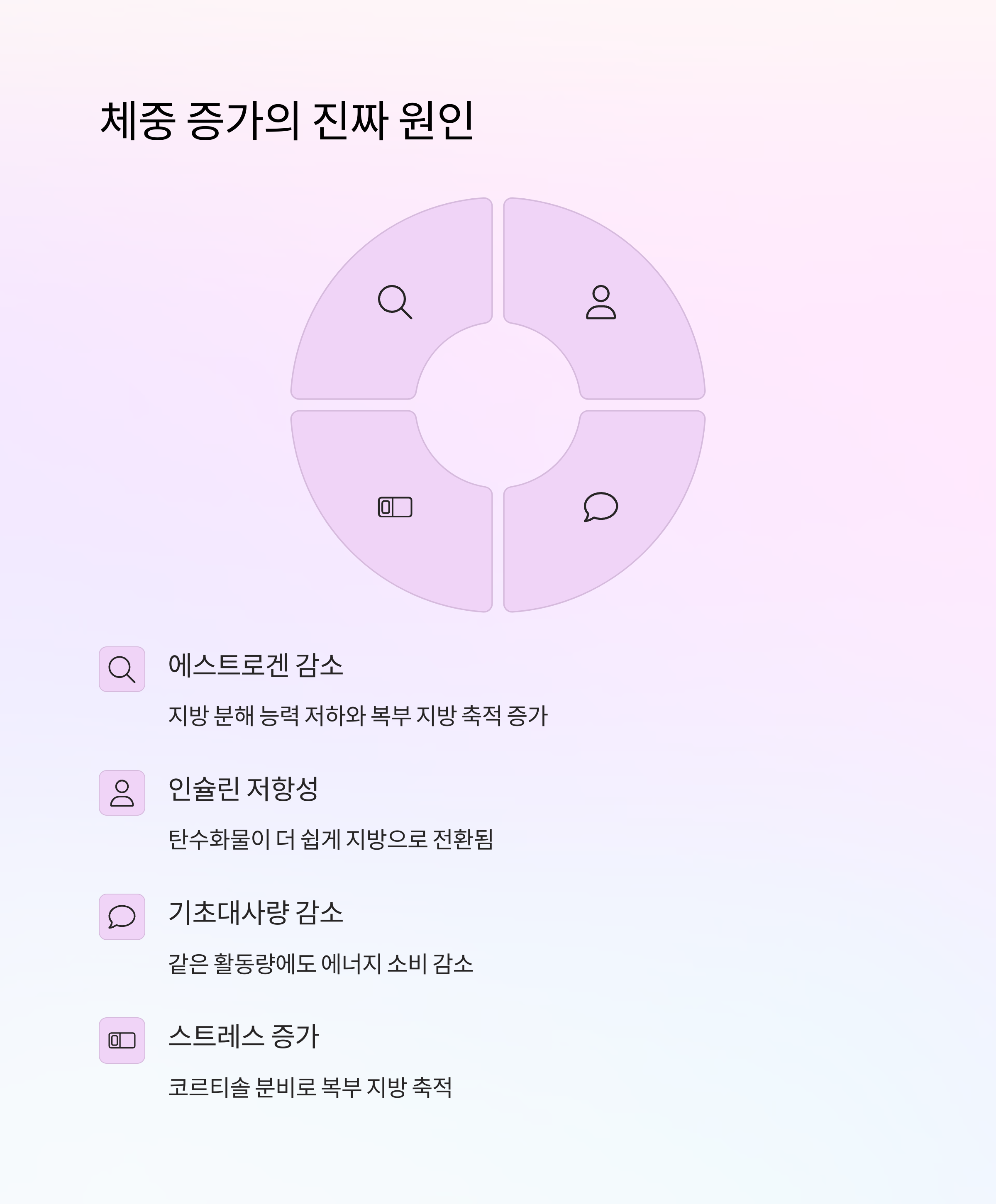 | 대사 변화 | 체중 증가, 복부 비만 | 기초대사량 감소 |
