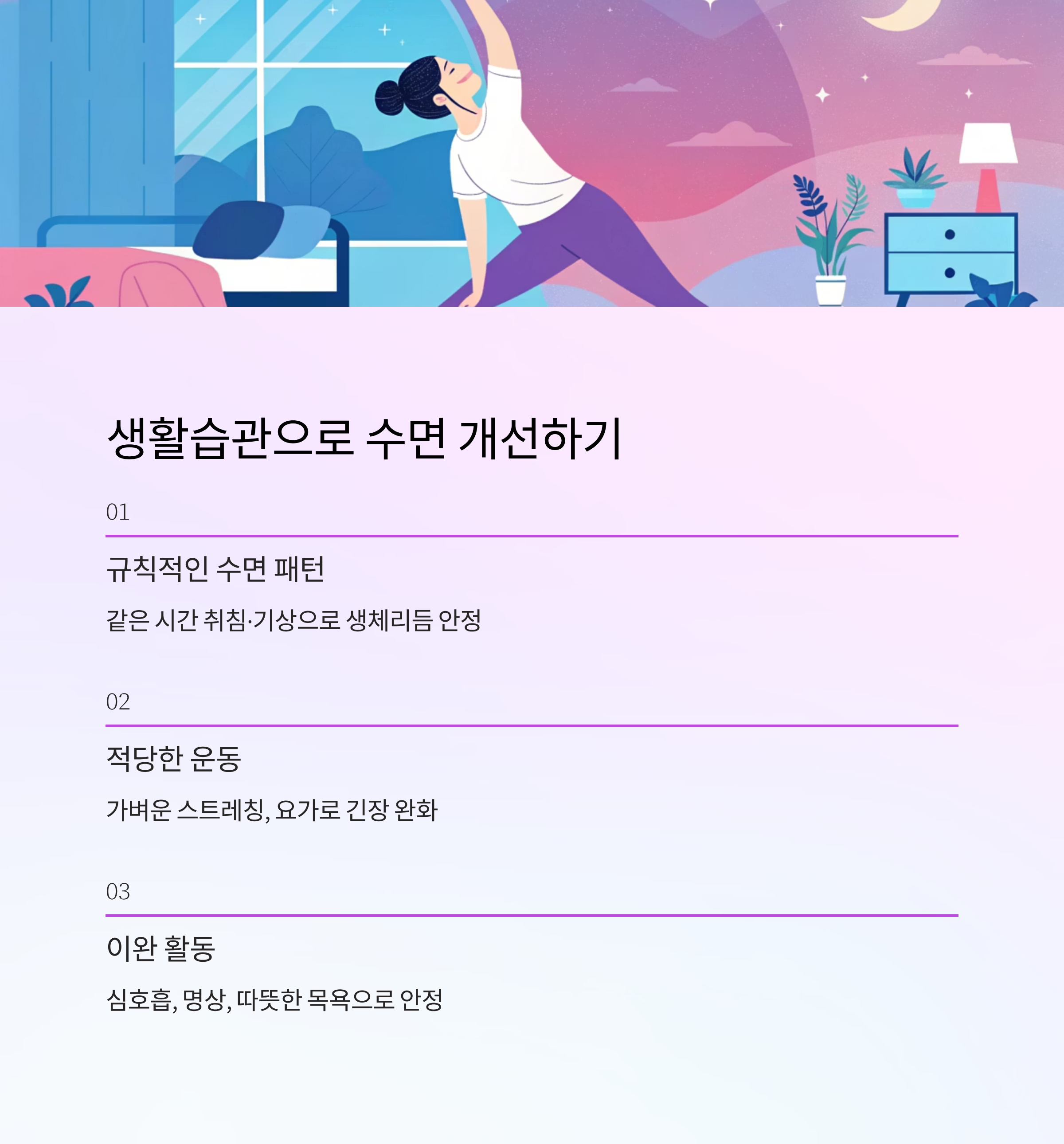 적당한 운동은 수면의 질을 높여줘요. 가벼운 스트레칭, 요가, 걷기 같은 활동은 긴장을 완화시키고 숙면을 유도해요. 단, 늦은 시간의 과도한 운동은 오히려 각성을 유발하니 주의해야 해요.