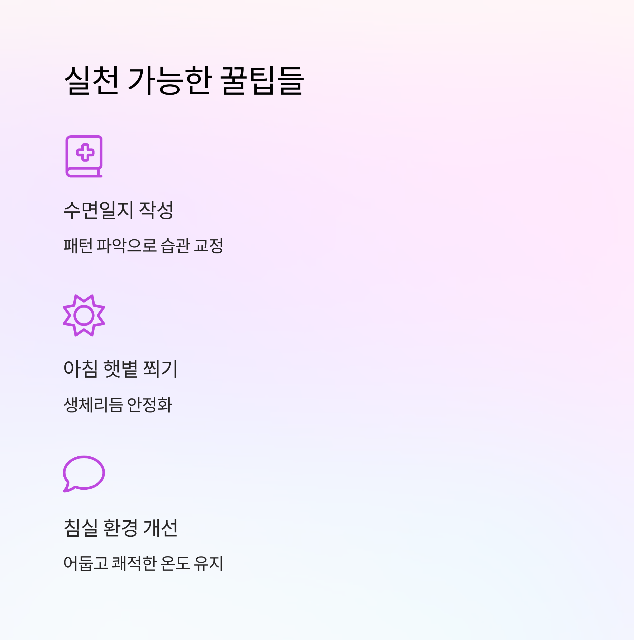 수면일지를 작성하는 것도 좋은 방법이에요. 언제 잠에 들고 몇 번이나 깨는지 기록하면 패턴을 파악할 수 있어요. 이를 바탕으로 습관을 교정하면 효과적이에요.