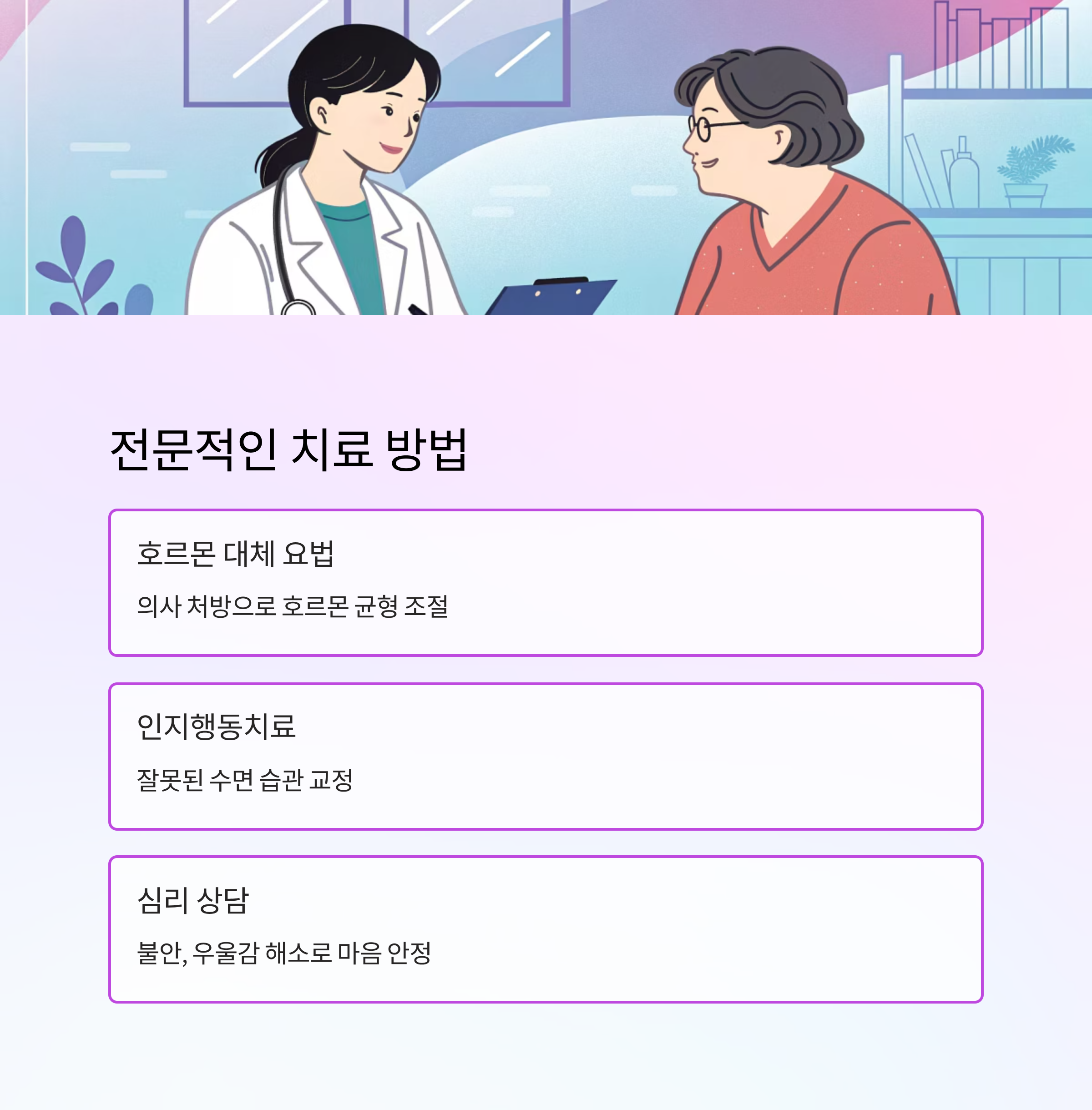 수면장애가 심하다면 전문의 상담을 받는 것이 좋아요. 호르몬 대체 요법(HRT), 수면제나 항우울제 같은 약물치료가 필요한 경우도 있어요. 다만 의사의 지시에 따라 안전하게 사용하는 것이 중요해요.