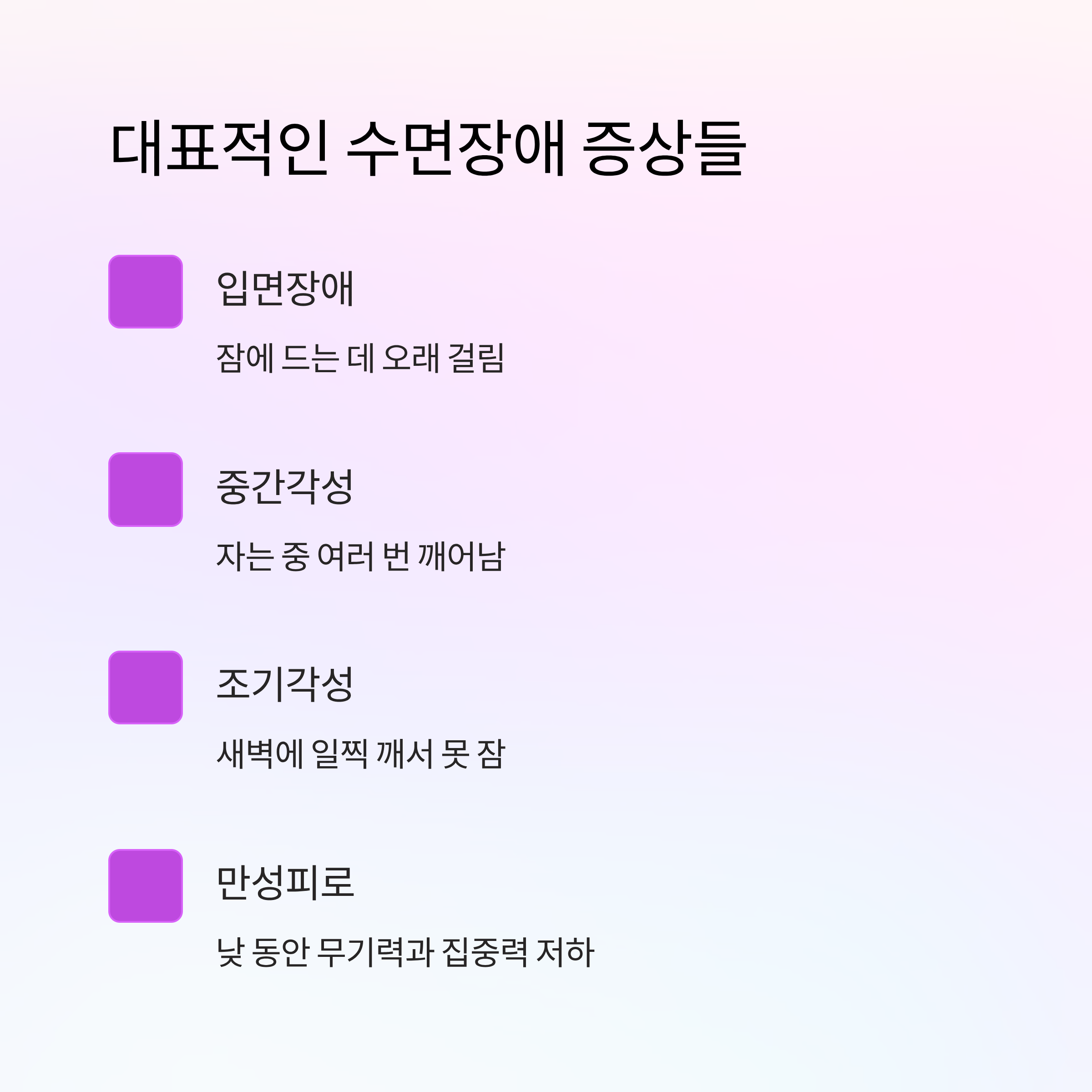 가장 흔한 증상은 잠에 드는 데 시간이 오래 걸리는 입면장애예요. 또 자는 중간에 여러 번 깨거나 새벽에 일찍 눈이 떠서 다시 잠들지 못하는 경우도 많아요. 이런 증상이 반복되면 만성 피로와 무기력이 이어져요.