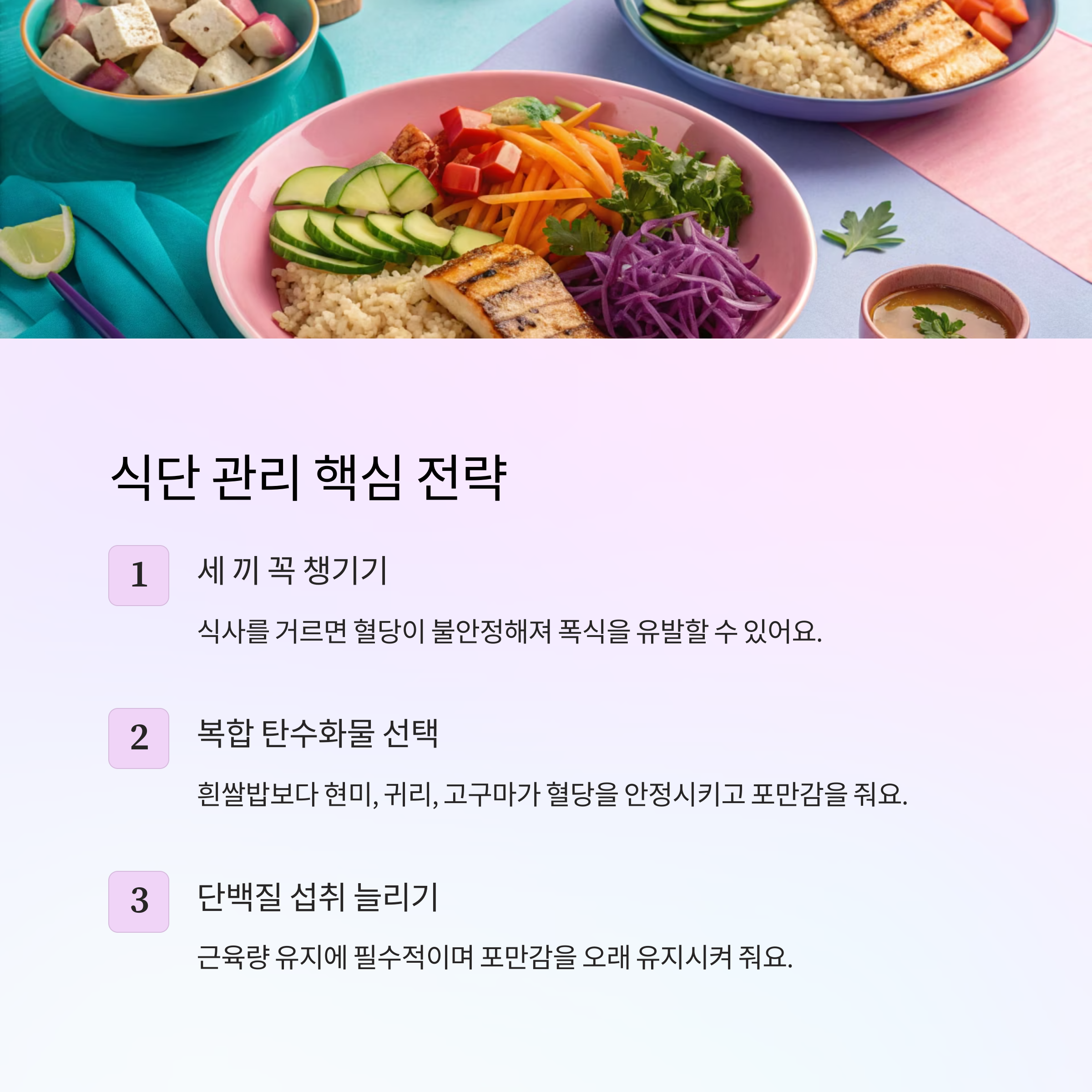 첫째, 하루 세끼는 꼭 챙겨 먹는 게 좋아요. 식사를 거르면 혈당이 급격히 떨어졌다가 올라가면서 폭식을 유발할 수 있어요. 특히 아침 식사는 대사를 시작하는 데 필수예요. 바쁘더라도 바나나와 두유처럼 간단한 식사라도 챙기는 습관을 들여야 해요.