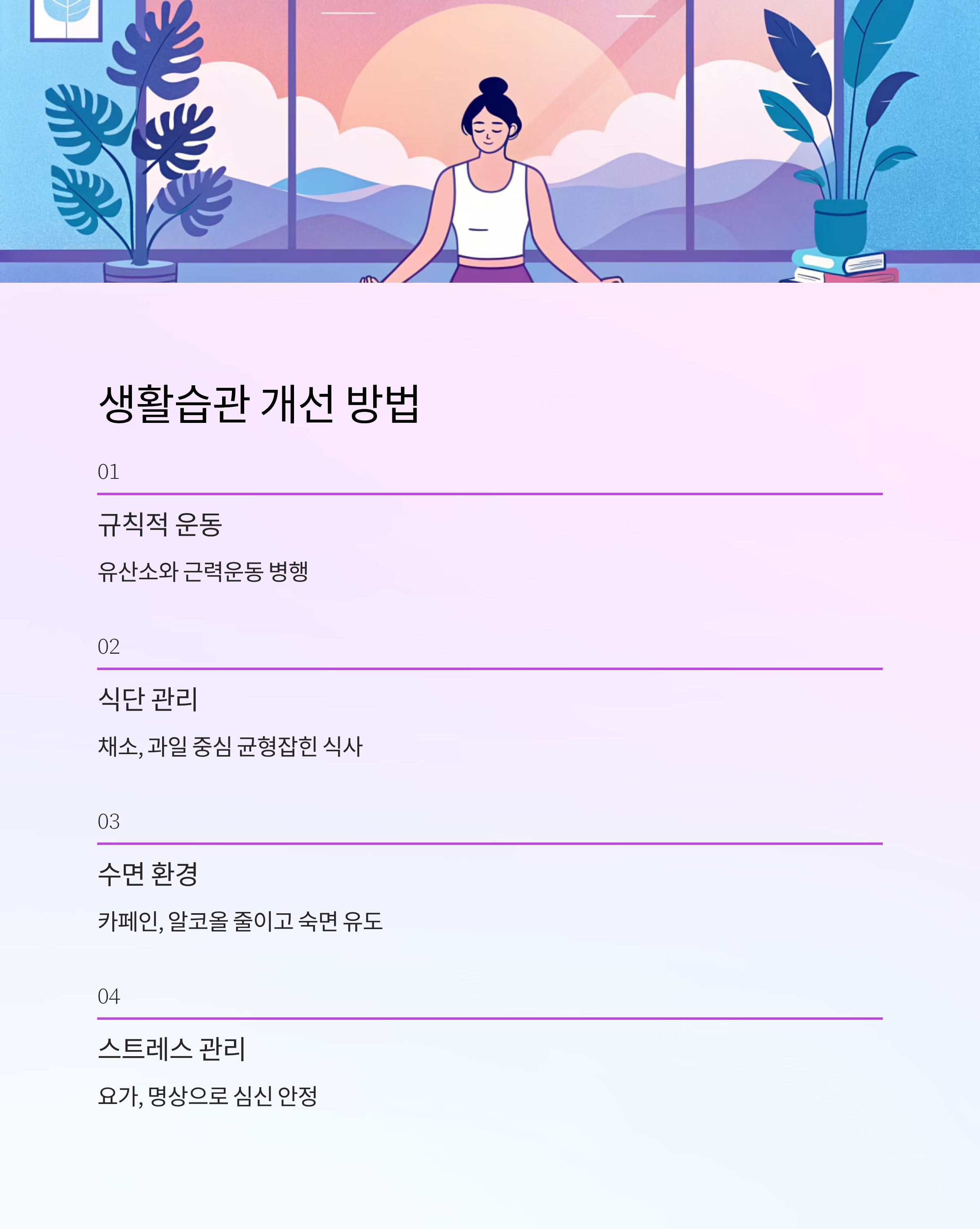 또한 카페인, 알코올 섭취를 줄이고 채소와 과일이 풍부한 식단을 유지하면 좋습니다. 수면 환경을 개선해 숙면을 유도하는 것도 중요한 관리 방법이에요.