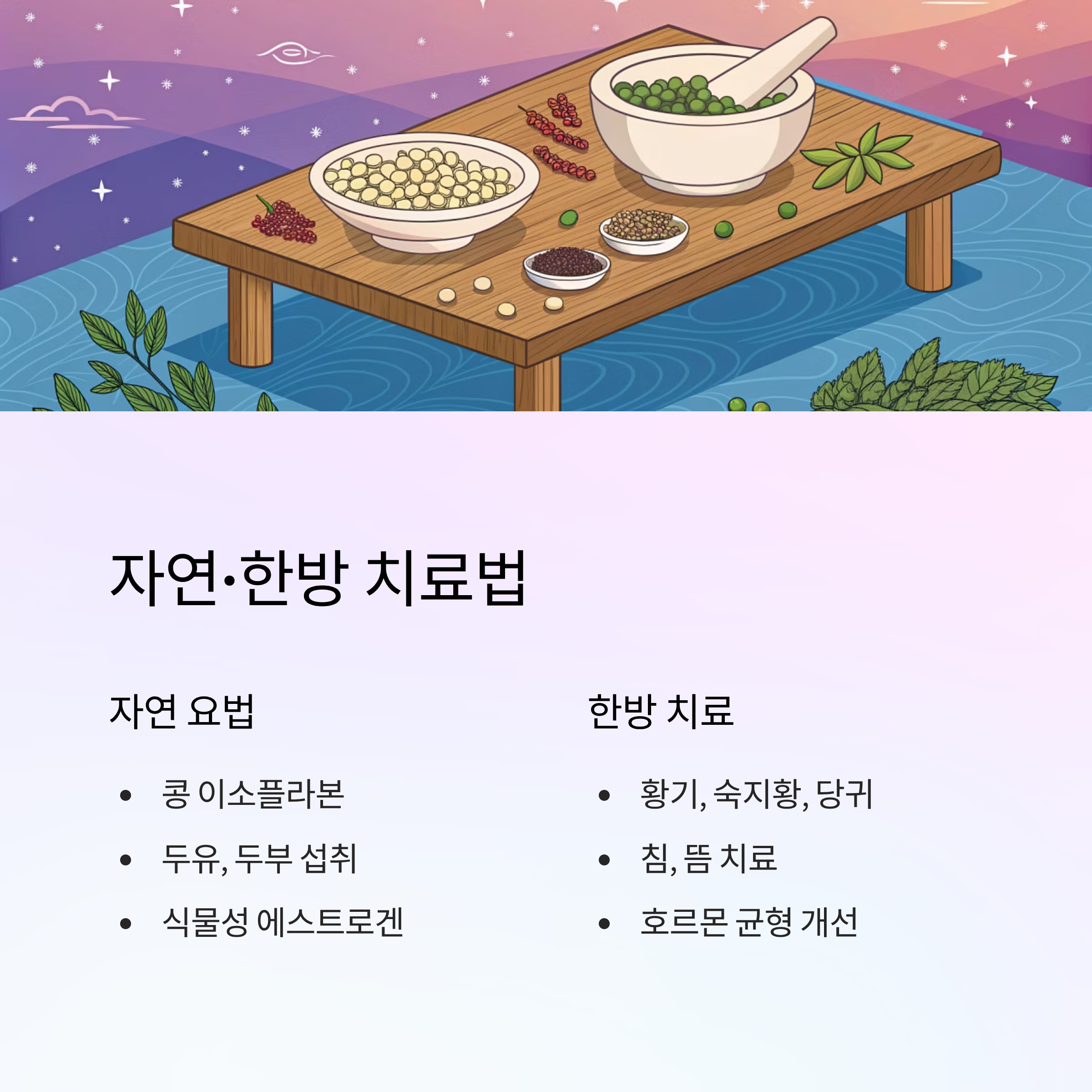 자연 요법으로는 콩에 포함된 이소플라본 같은 식물성 에스트로겐이 대표적이에요. 두유나 두부, 보충제를 통해 섭취할 수 있어요. 한방에서는 황기, 숙지황, 당귀 등 여성 호르몬 균형을 돕는 약재가 쓰여요.