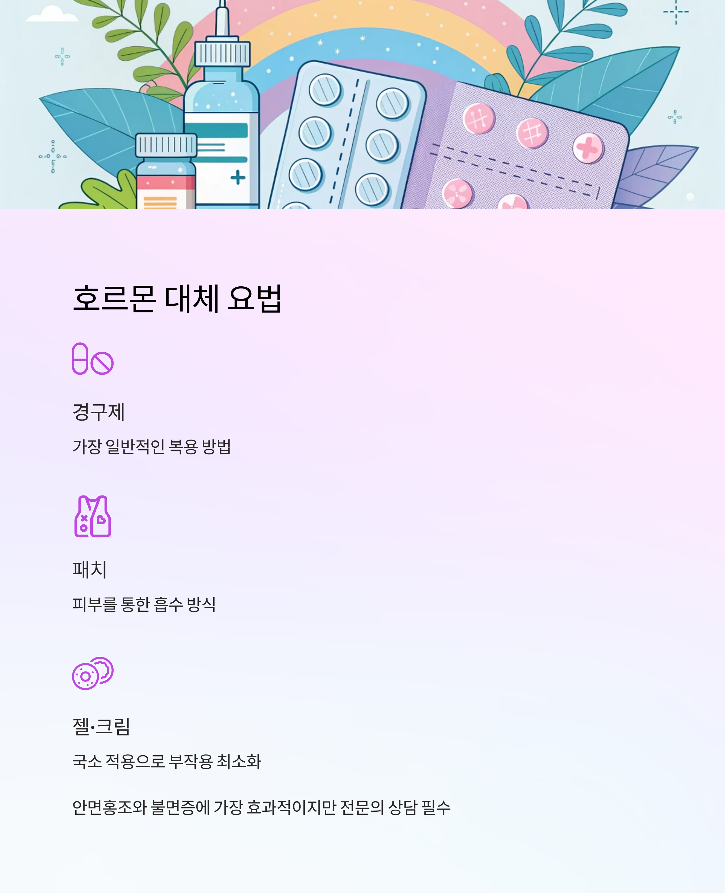 하지만 유방암, 혈전증, 뇌졸중 같은 위험성이 일부 보고되어서 반드시 개인의 건강 상태를 고려해 전문의 상담 후 결정하는 것이 좋아요. 최근에는 저용량 제제와 국소 적용법이 널리 사용돼 부작용 위험을 줄이고 있어요.