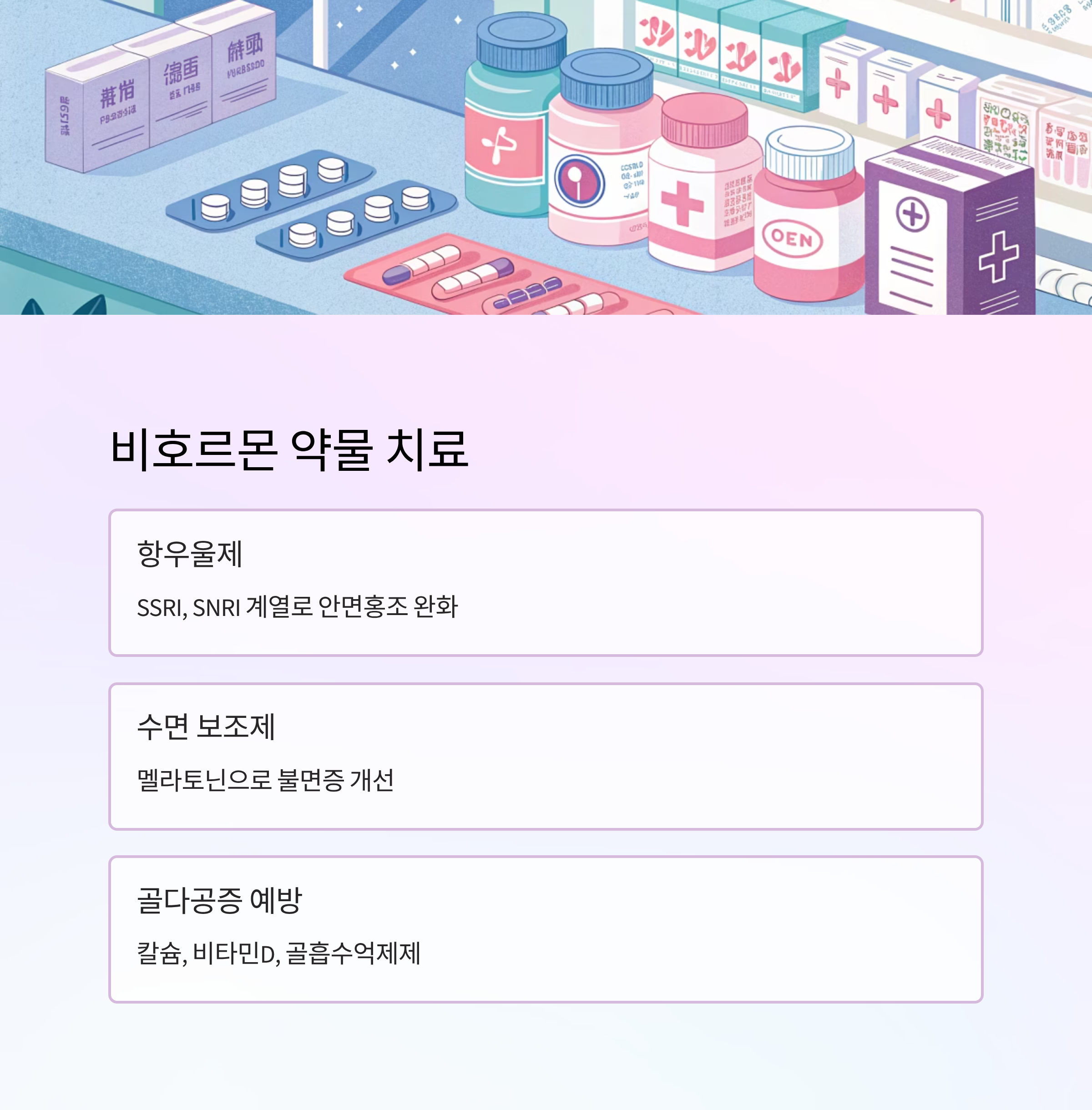 호르몬 요법이 부담스러운 경우 항우울제, 항경련제 같은 약물이 사용돼요. 특히 SSRI나 SNRI 계열은 안면홍조와 불안 증상 완화에 도움을 줄 수 있어요. 또한 불면증에는 수면제보다는 멜라토닌 보충이 고려되기도 해요.