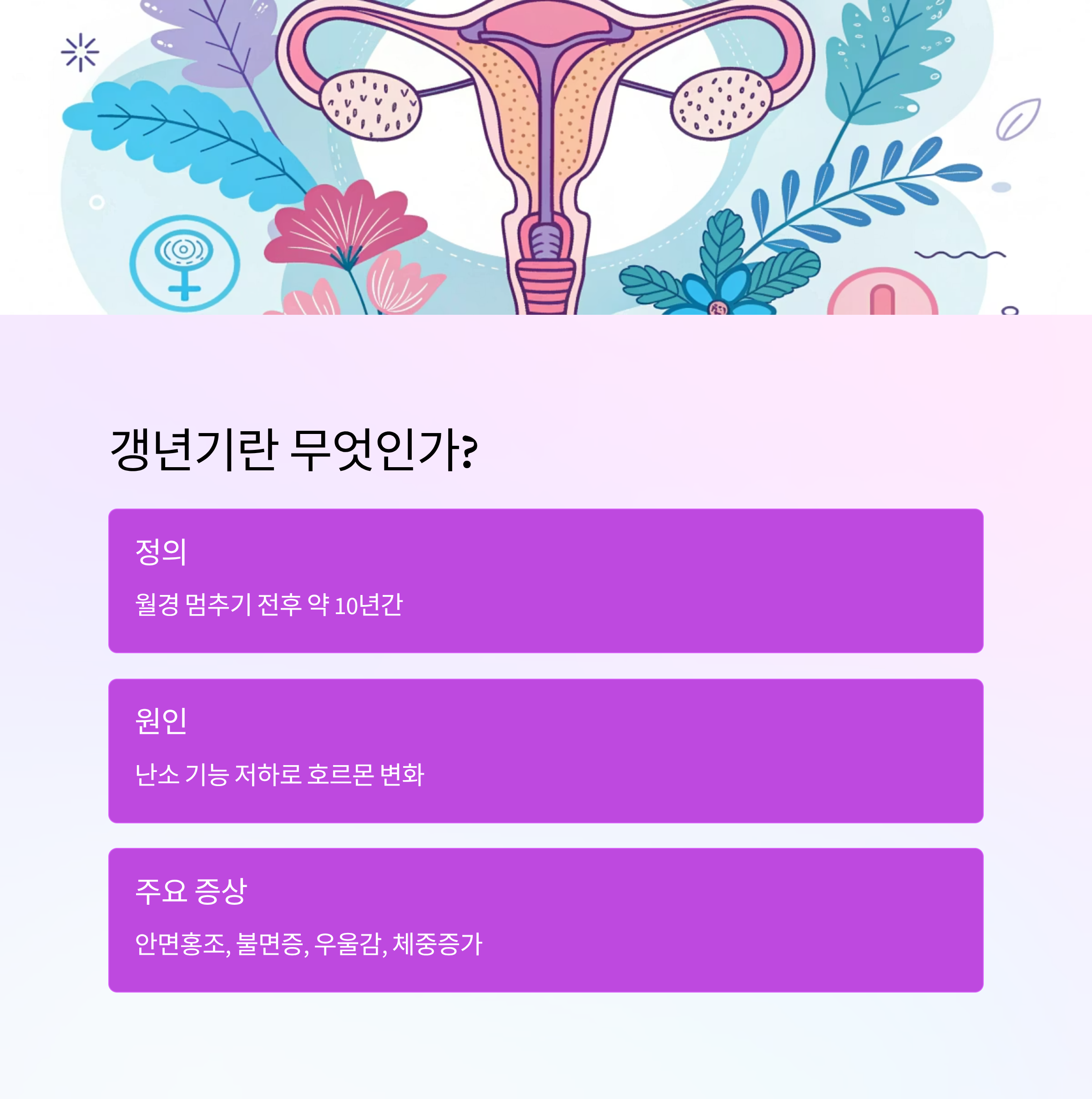 갱년기는 여성의 삶에서 피할 수 없는 중요한 전환기예요. 보통 45세 전후에 나타나며, 난소 기능 저하로 호르몬 균형이 크게 달라져요. 이 시기에 나타나는 대표적인 증상은 안면홍조, 수면 장애, 우울감, 체중 증가, 뼈 건강 약화 등이 있어요.