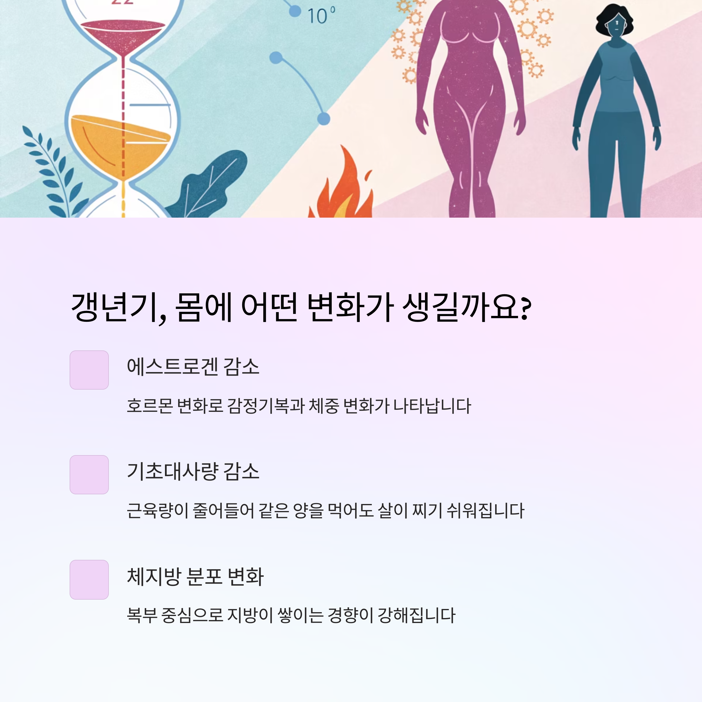 갱년기는 여성에게 찾아오는 생물학적 전환기예요. 대개 45세에서 55세 사이에 나타나며, 이 시기에는 호르몬 변화로 인해 체중 증가, 근육 감소, 피로감 등의 변화가 함께 나타나요. 예전과 똑같이 먹는데 체중이 느는 이유도 바로 이런 변화 때문이랍니다.