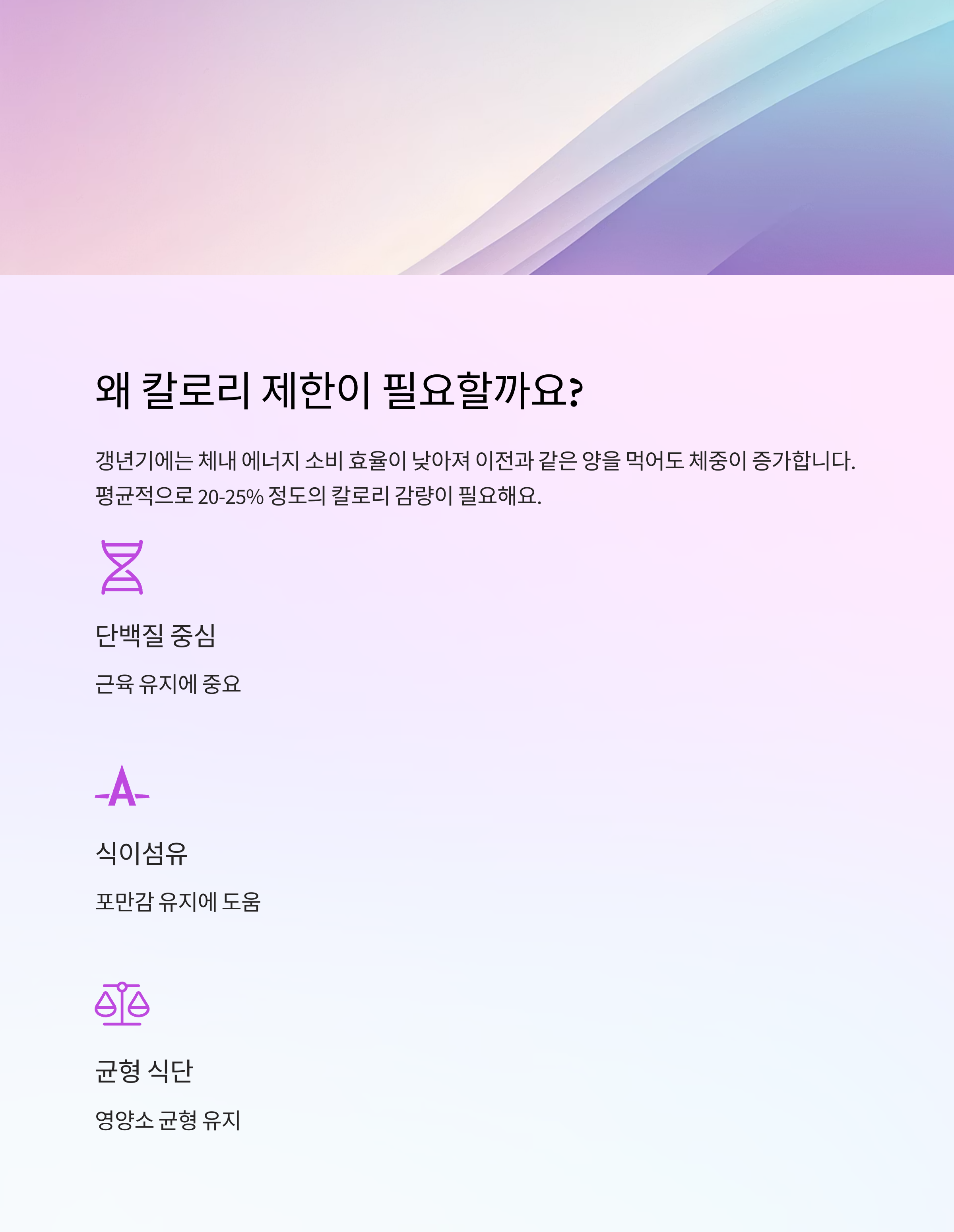 이런 변화를 이해하고 받아들이는 것이 갱년기 관리를 위한 첫걸음이에요. 그리고 그 중심에 바로 '현실적인 칼로리 제한'이 있다는 사실! 😇