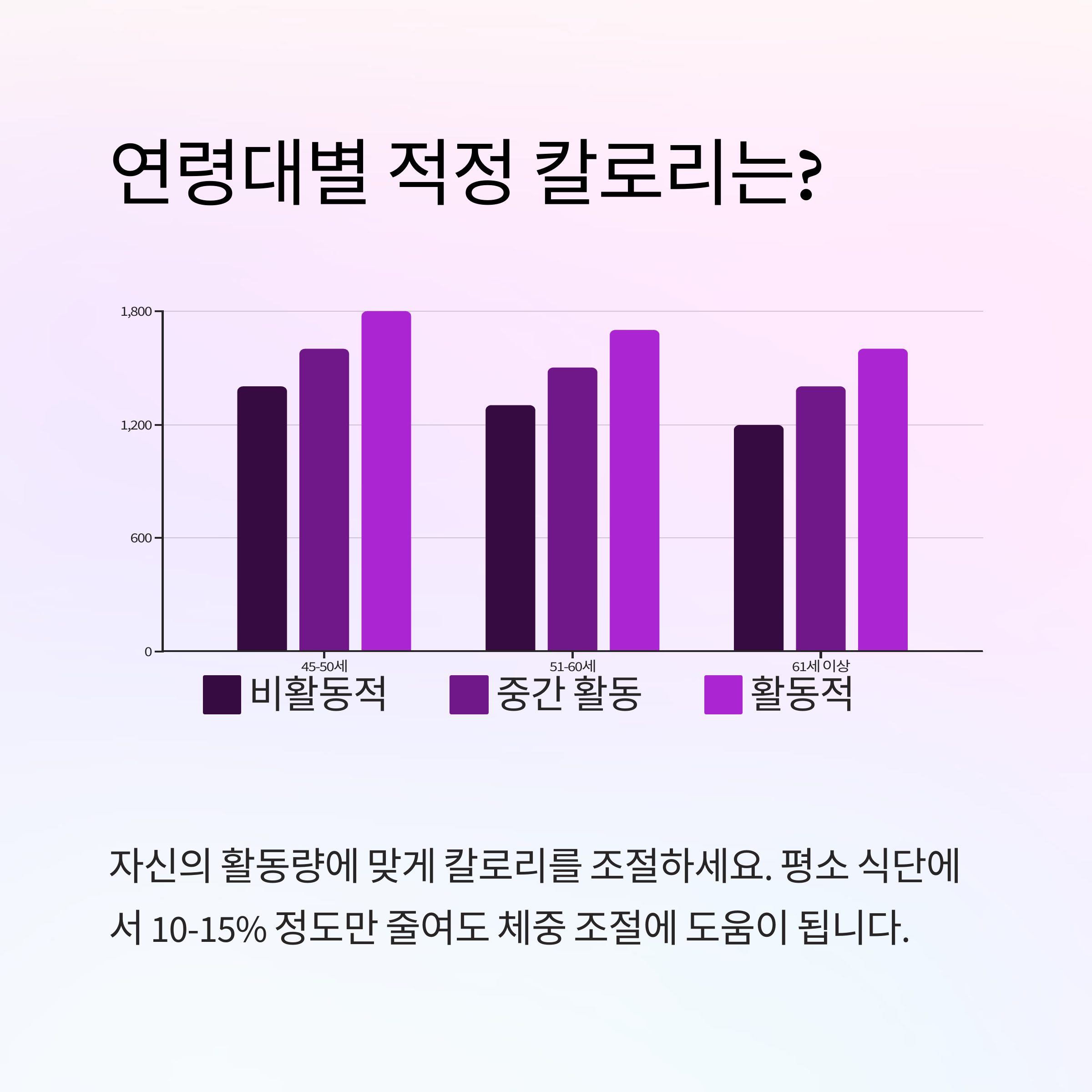 갱년기를 맞이한 여성의 연령대는 대개 40대 후반에서 60대 초반이에요. 이 시기의 칼로리 요구량은 활동 수준과 건강 상태에 따라 달라지지만, 평균적으로 아래 기준을 참고할 수 있어요.
