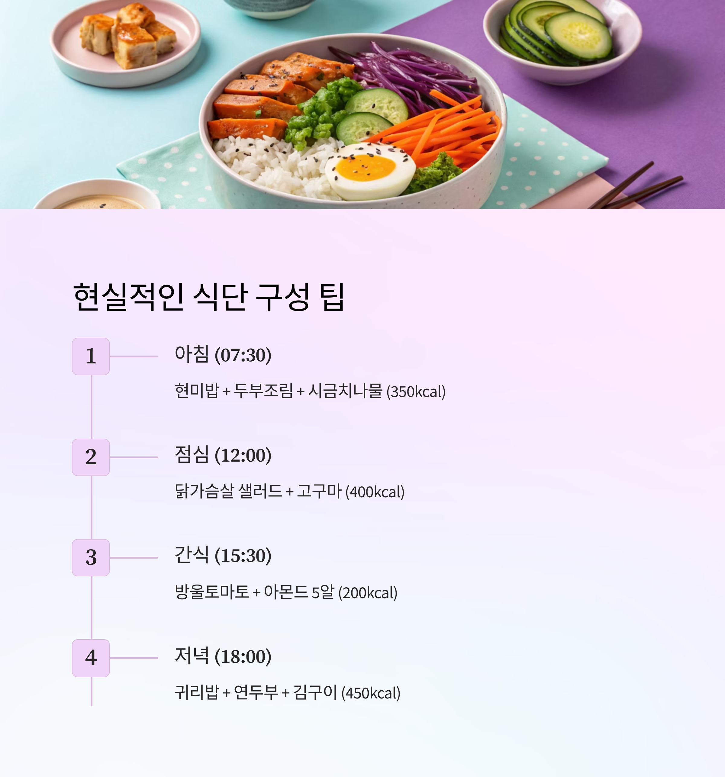 무리하지 않고, 식사 시간을 지키면서 먹는 게 포인트예요. 무엇보다 음식에 대한 스트레스를 줄이는 것이 장기적으로 큰 도움이 된답니다! 🍴