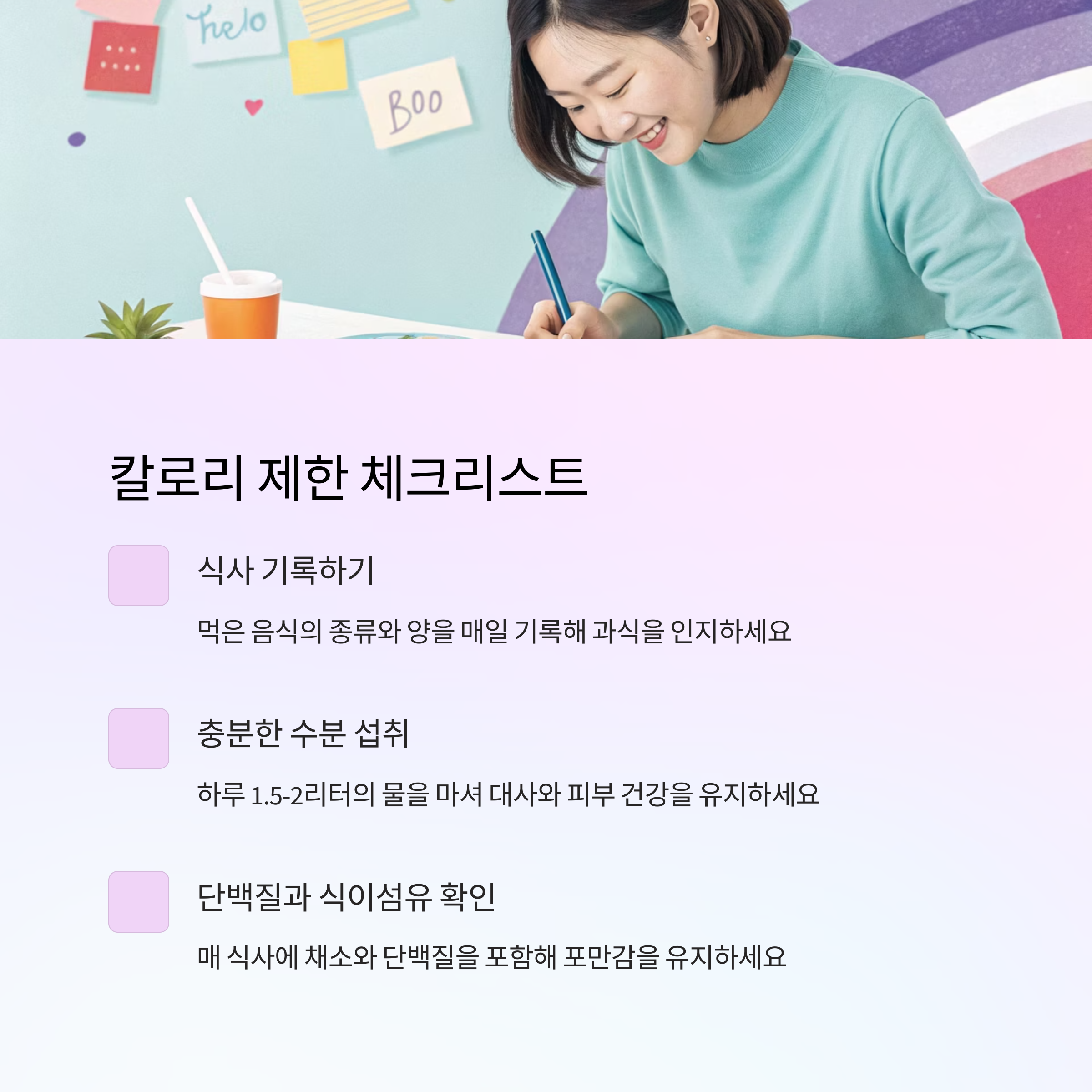 칼로리 제한을 시작할 땐, 일단 평소 먹는 식단을 기록해보고 평균 섭취량을 확인해보는 게 좋아요. 거기서 10~15% 정도만 줄여도 체중 조절에 도움이 되는 경우가 많답니다. 📉