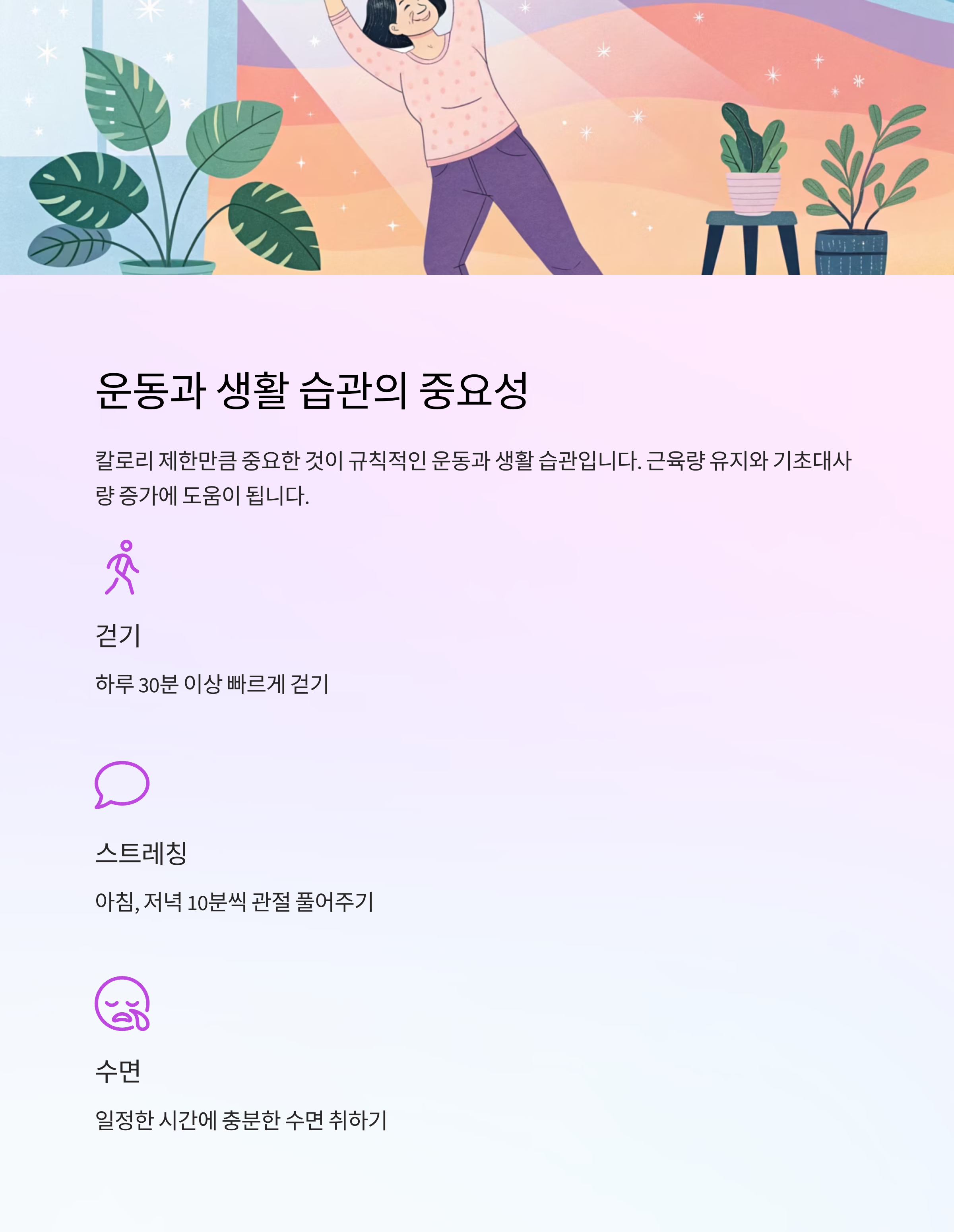 갱년기에는 식단만큼이나 중요한 게 바로 생활 습관이에요. 아무리 칼로리를 제한해도 움직임이 부족하면 근육량이 줄어들고, 대사 기능도 점점 떨어지게 돼요. 꾸준한 신체 활동은 갱년기 증상 완화에도 큰 도움이 돼요.