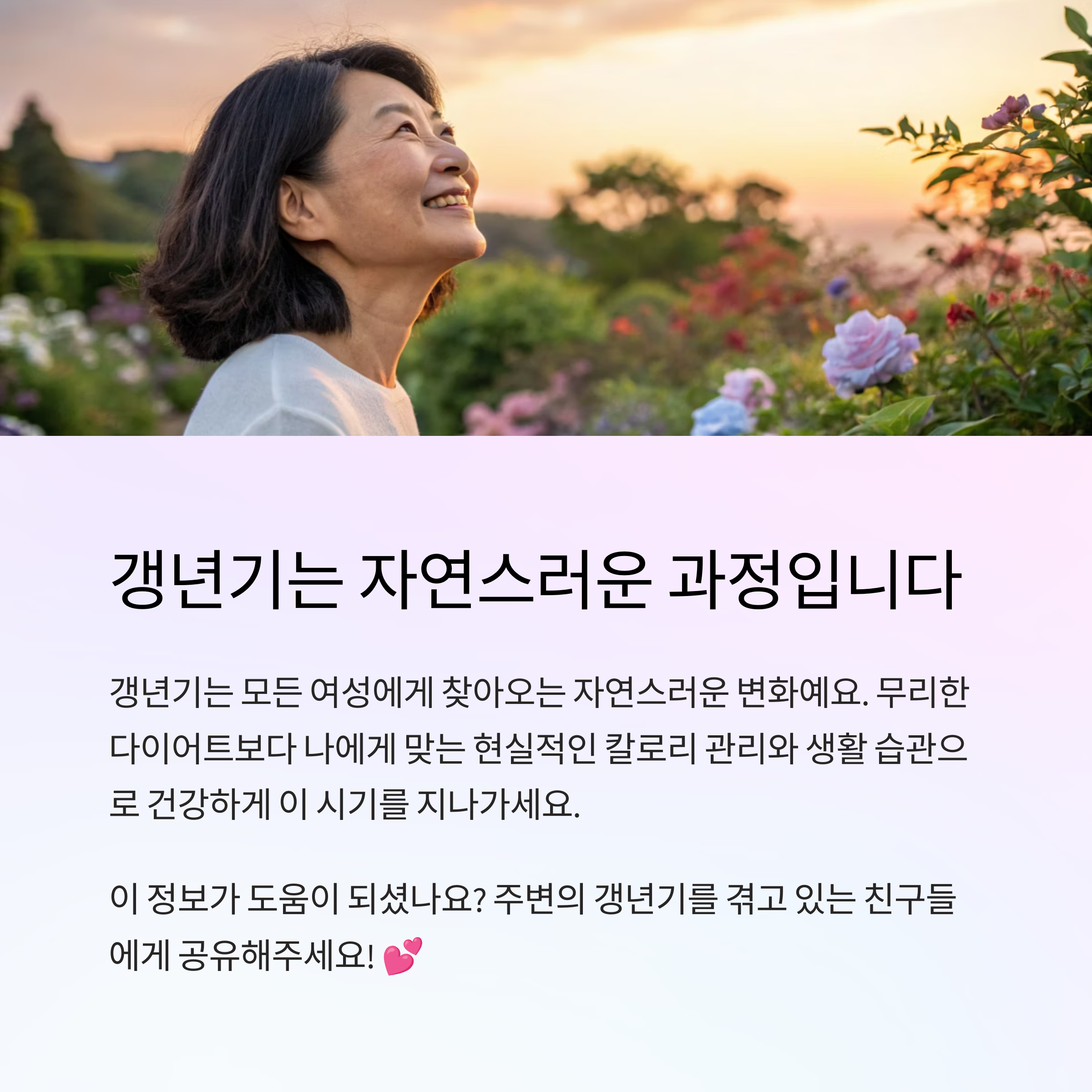 이처럼 식단과 운동, 수면을 균형 있게 조절하는 것이 갱년기 건강관리의 핵심이에요. 규칙적인 루틴은 몸뿐 아니라 마음에도 긍정적인 영향을 준답니다. 💗