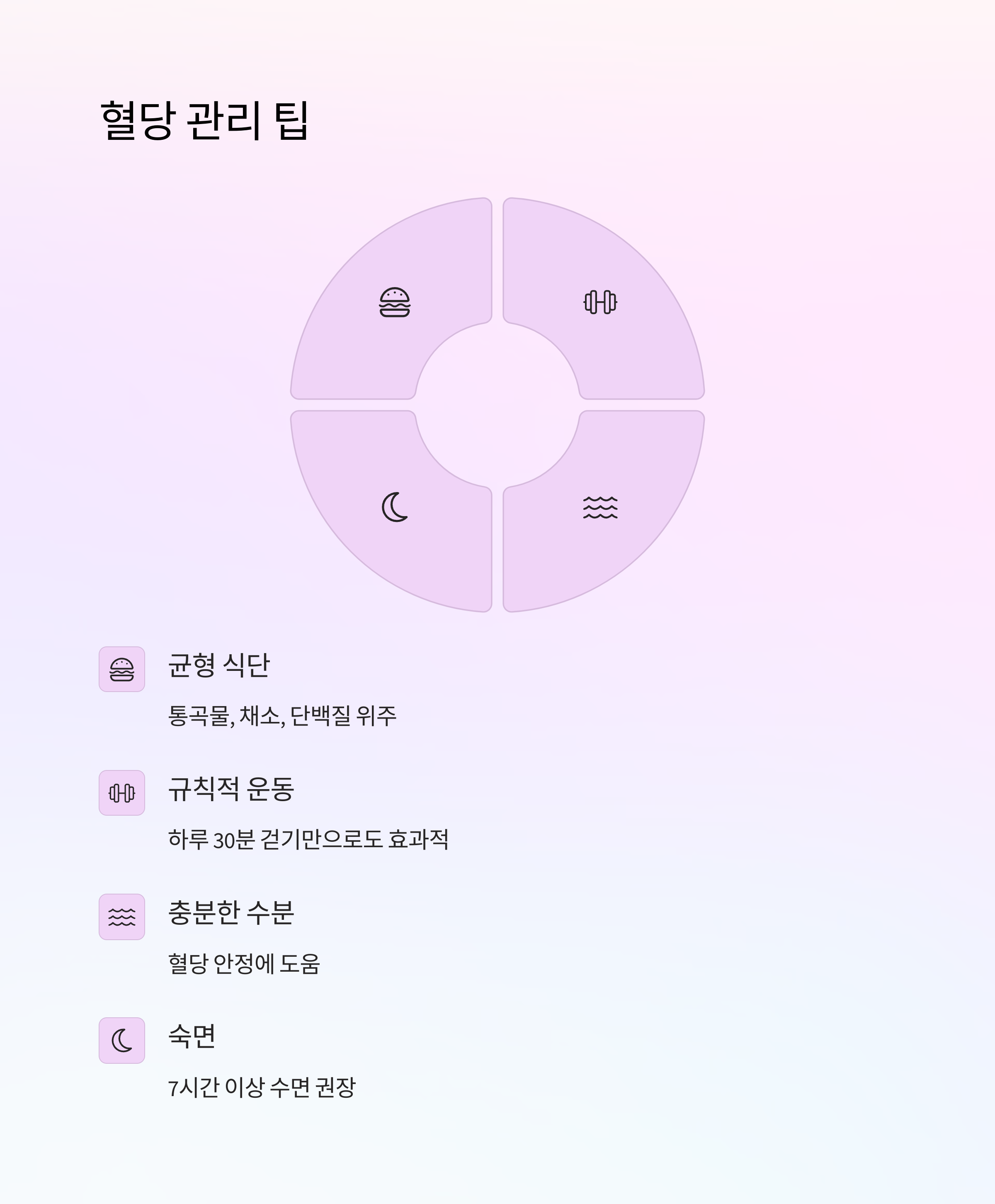 수면도 혈당에 영향을 줘요. 하루 7시간 이상의 숙면은 혈당 조절에 필수적인 요소랍니다. 또한 충분한 수분 섭취와 스트레스 관리를 병행해야 해요.