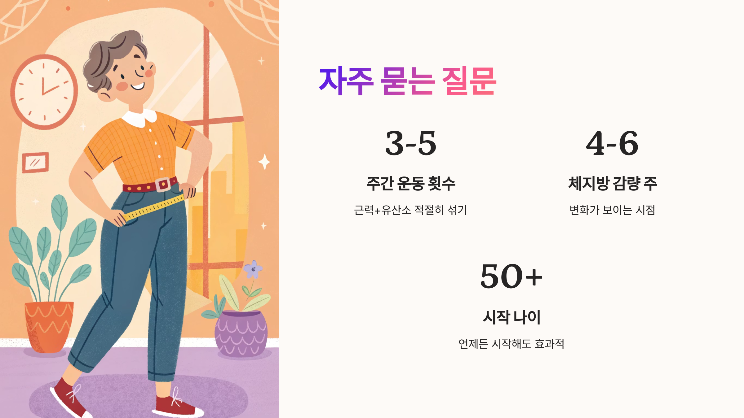 처음에는 횟수보다 '자세'에 집중하는 게 훨씬 더 중요해요. 올바른 자세로, 천천히 운동하는 것. 이게 50대 운동의 성공 포인트랍니다! 😉