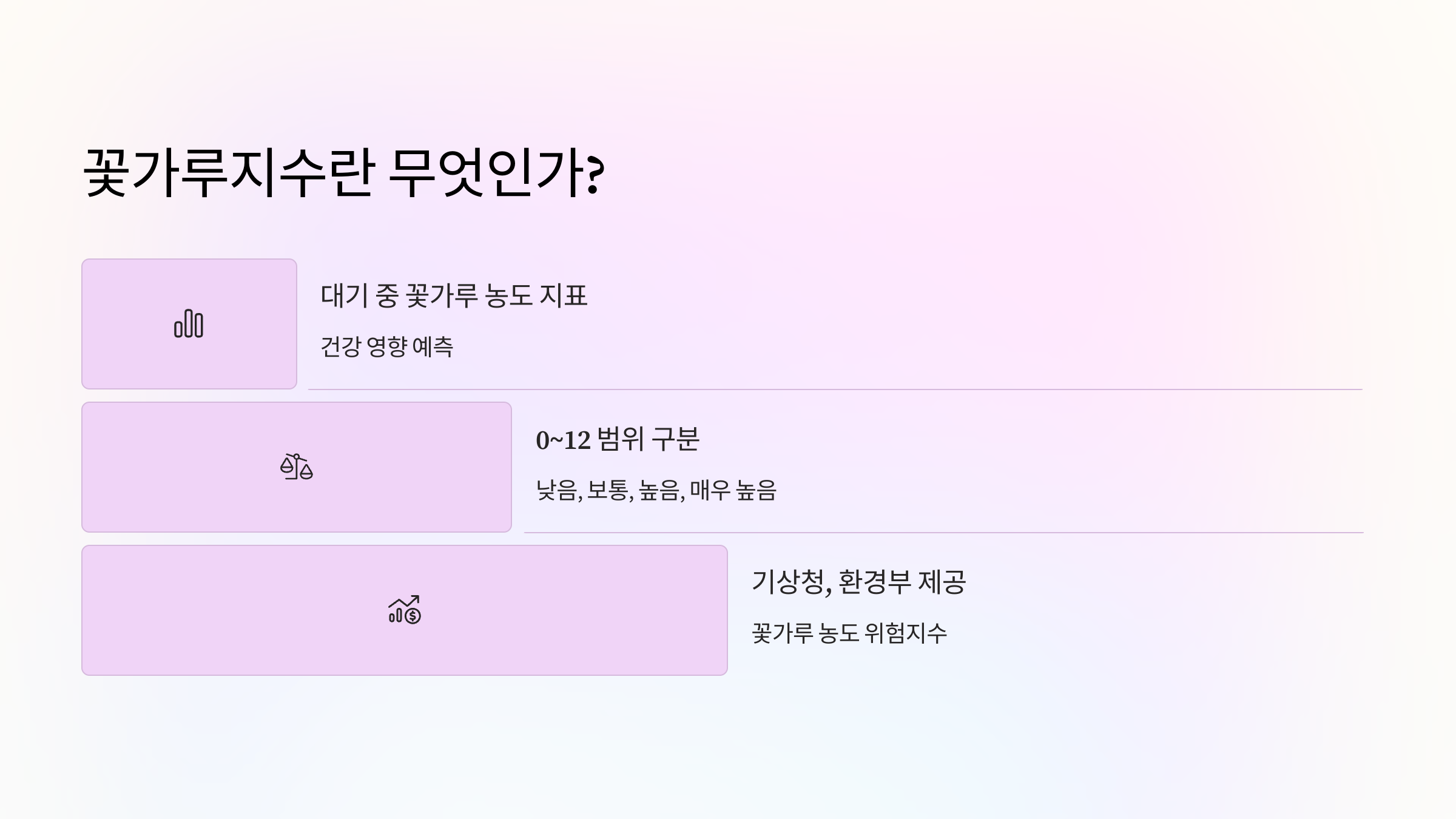 꽃가루지수(Pollen Index)는 대기 중 꽃가루 농도를 수치로 나타낸 지표예요. 이 수치를 통해 꽃가루로 인한 건강 영향을 예측할 수 있어요. 꽃가루지수가 높을수록 야외활동 시 주의가 필요해요.