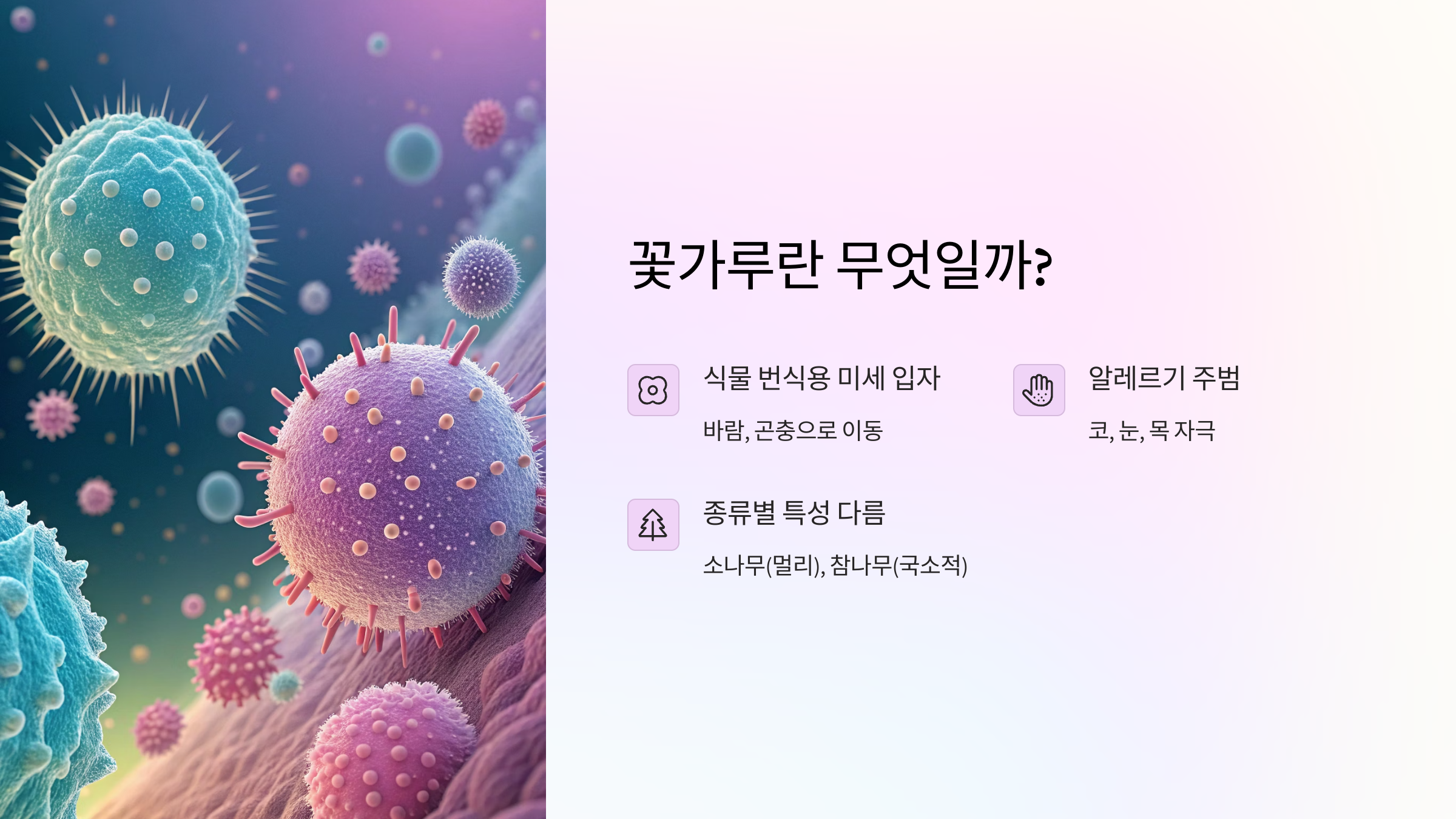 꽃가루는 종류에 따라 크기, 모양, 비행 거리 등이 다르답니다. 예를 들면 소나무 꽃가루는 멀리까지 날아가고, 참나무 꽃가루는 무겁고 국소적으로 떨어지죠. 이 특성에 따라 알레르기 증세도 조금씩 달라질 수 있어요.