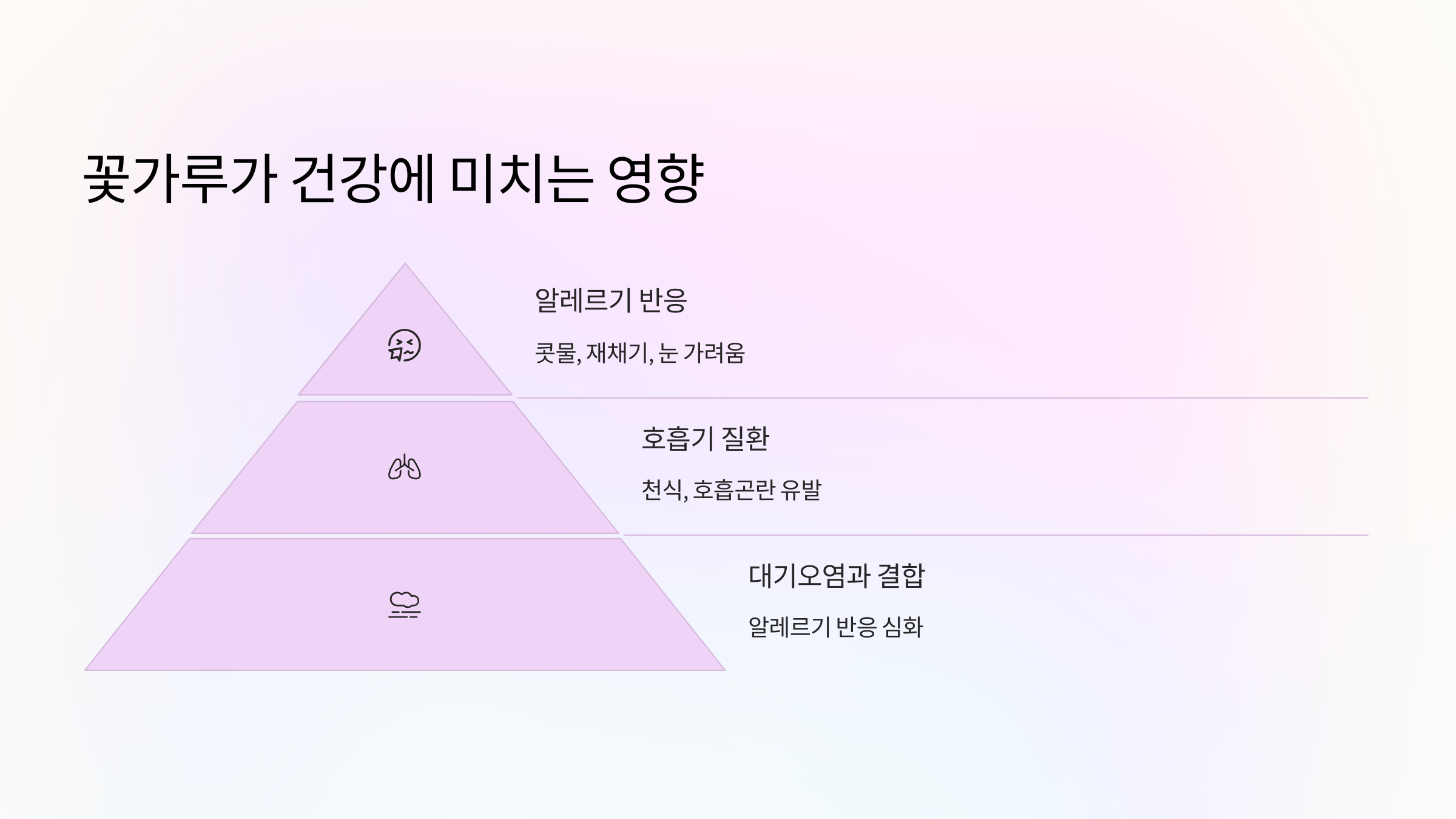 꽃가루는 알레르기성 비염, 천식, 결막염 등 다양한 알레르기 질환을 유발할 수 있어요. 꽃가루가 코 점막이나 기관지에 들어오면 우리 몸은 이물질로 인식하고 과도한 면역 반응을 일으키게 되죠. 이로 인해 콧물, 재채기, 코막힘, 눈 가려움 등이 나타나게 돼요.