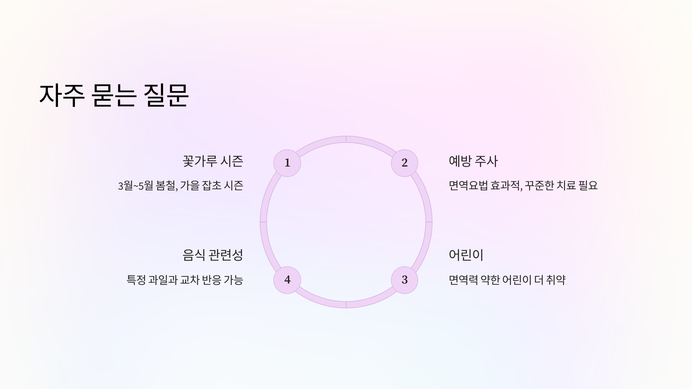 A1. 보통 3월~5월 봄철이 가장 심하지만, 가을에도 잡초 꽃가루로 증상이 심할 수 있어요.