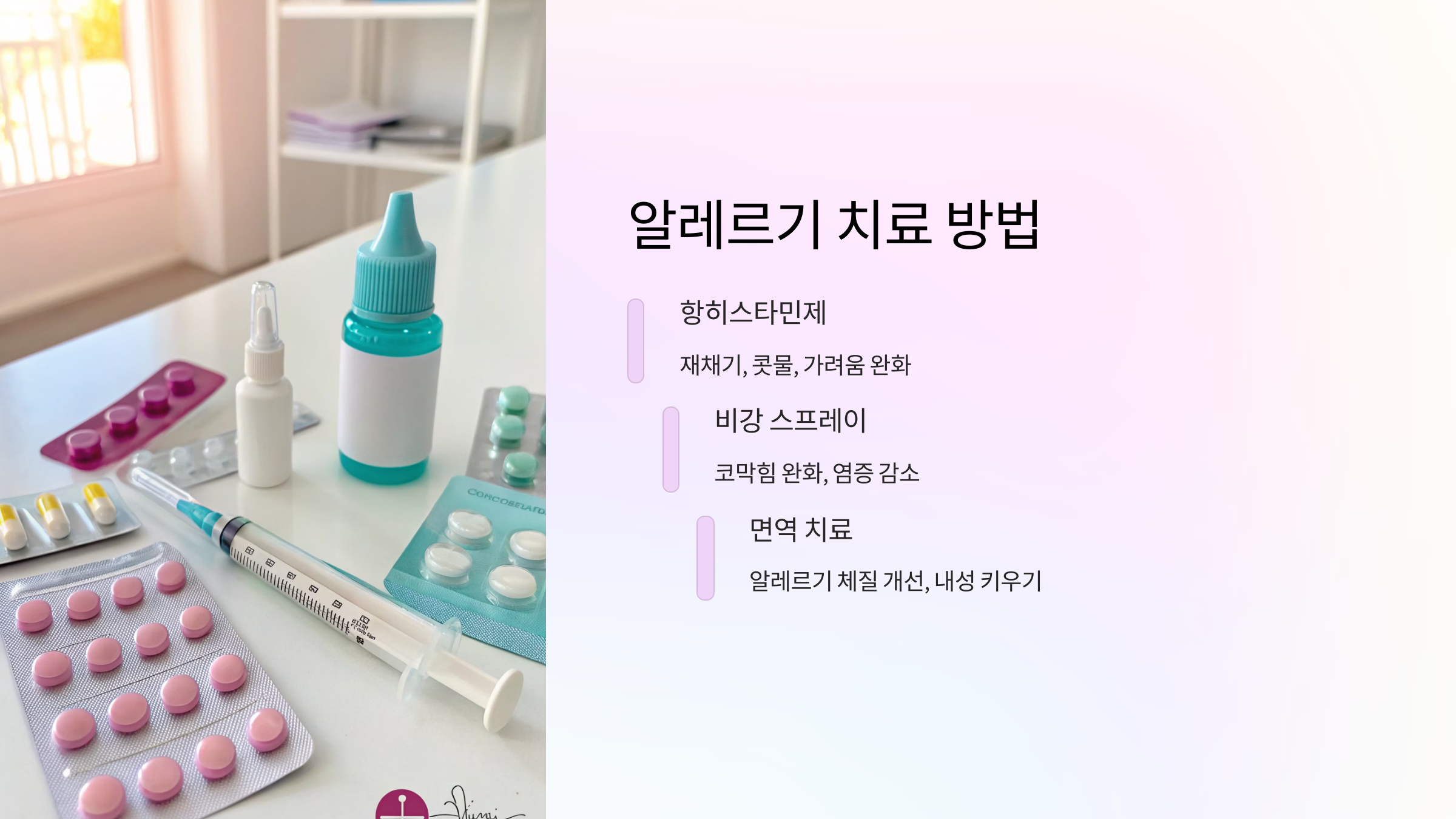 꽃가루 알레르기 증상이 심할 경우 약물 치료가 필요할 수 있어요. 가장 흔하게 사용되는 약물은 항히스타민제인데, 재채기, 콧물, 가려움을 빠르게 완화시켜줘요.