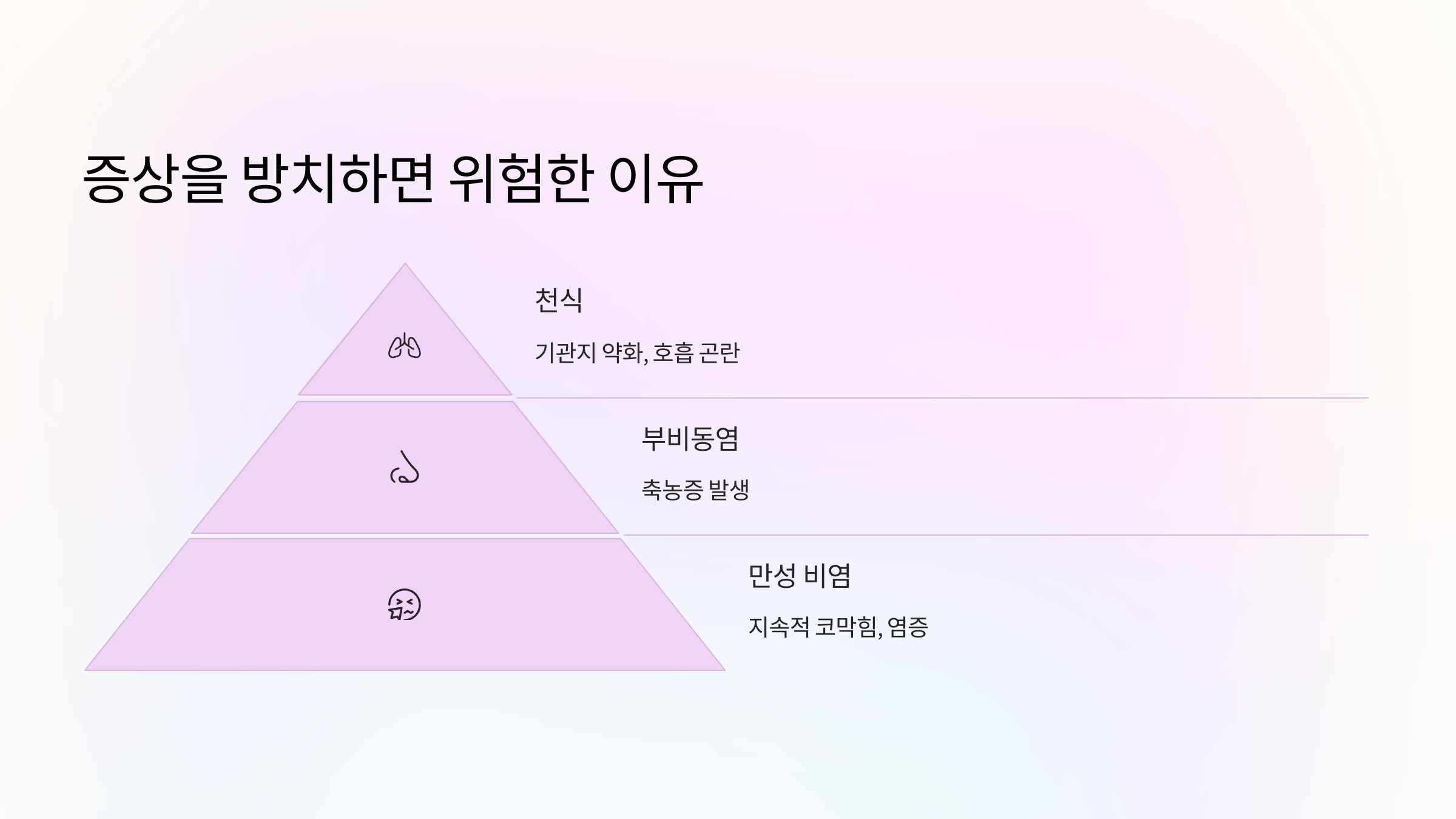 | 만성 비염 | 코막힘과 콧물이 지속되어 만성 염증으로 악화 |
