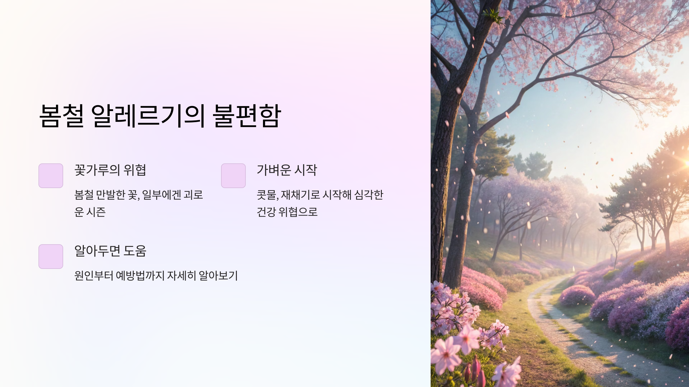 꽃이 만발하는 봄, 선선한 바람과 함께 기분 좋은 계절이지만, 일부 사람들에게는 괴로운 시즌이기도 해요. 바로 '꽃가루 알레르기' 때문이죠. 알레르기 반응은 가벼운 콧물이나 재채기에서 시작될 수 있지만, 심각하게 방치할 경우 건강에 큰 위협이 될 수 있다는 사실, 알고 있었나요?