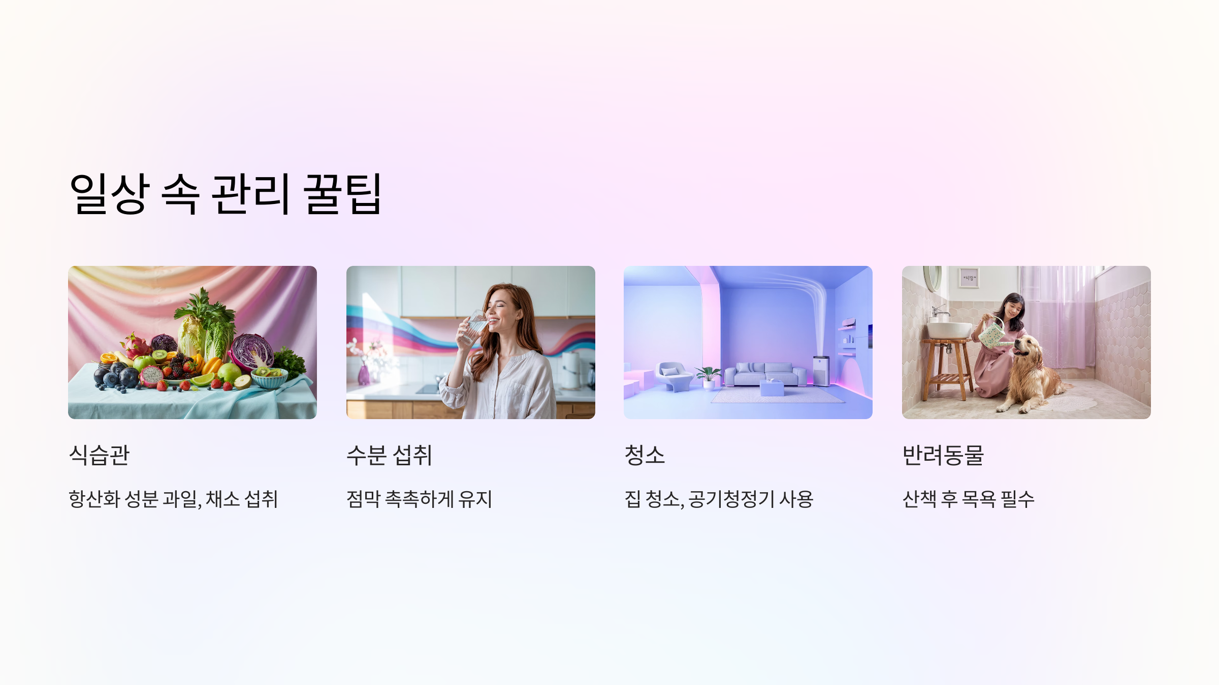 집 청소를 자주 하고, 공기청정기를 사용하며, 반려동물이 있다면 산책 후 꼭 목욕을 시켜주는 것도 좋아요. 꽃가루를 외부에서 집안으로 들여오지 않는 게 포인트예요.