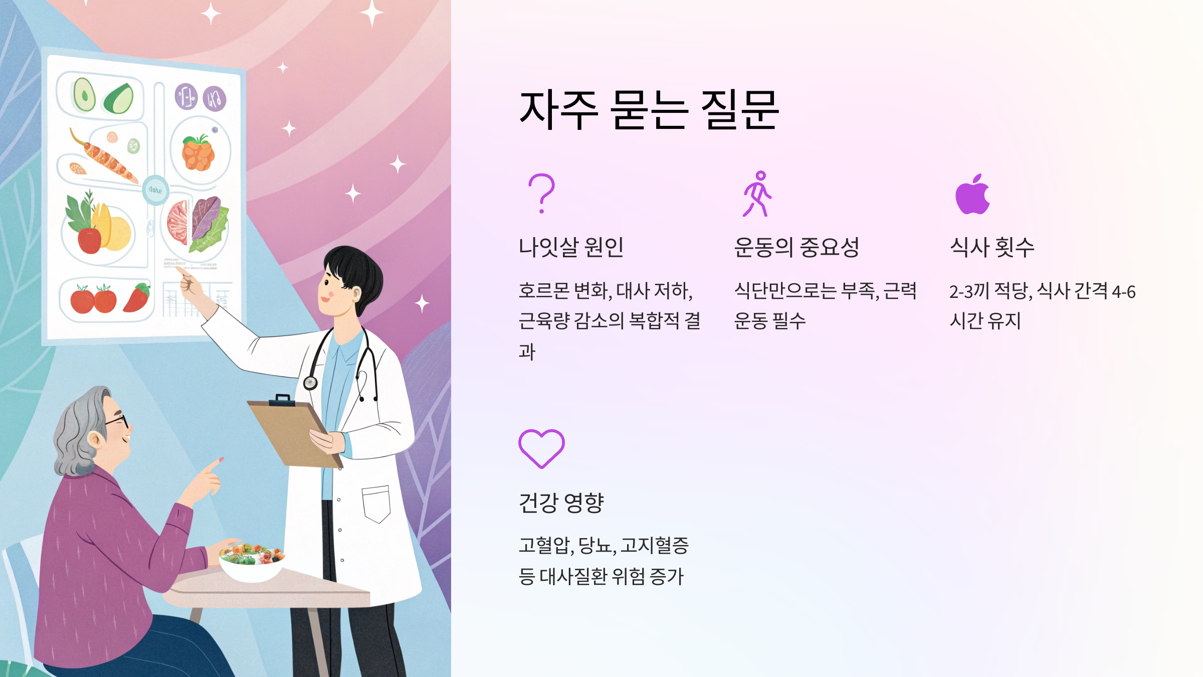 A8. 나잇살은 단순히 외모 문제를 넘어서 고혈압, 당뇨, 고지혈증 같은 대사질환과 연관이 있어요. 그래서 조기에 예방하고 관리하는 것이 정말 중요해요.
