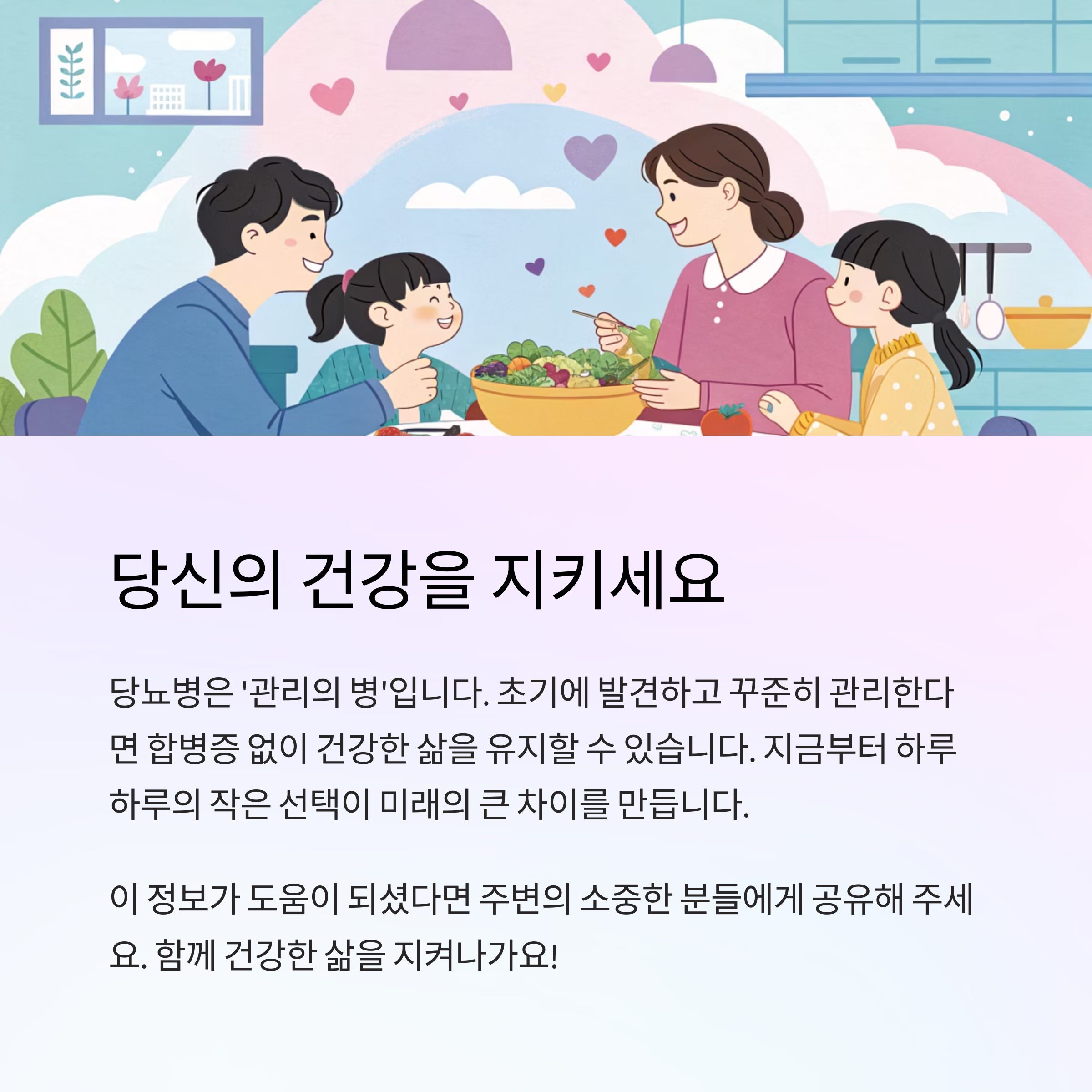 당뇨병은 ‘관리의 병’이라고 해요. 의지가 필요하지만, 불가능한 게 아니에요. 지금부터 하루하루의 작은 선택이 미래의 큰 차이를 만들어요. 여러분도 할 수 있어요. 화이팅! 💪