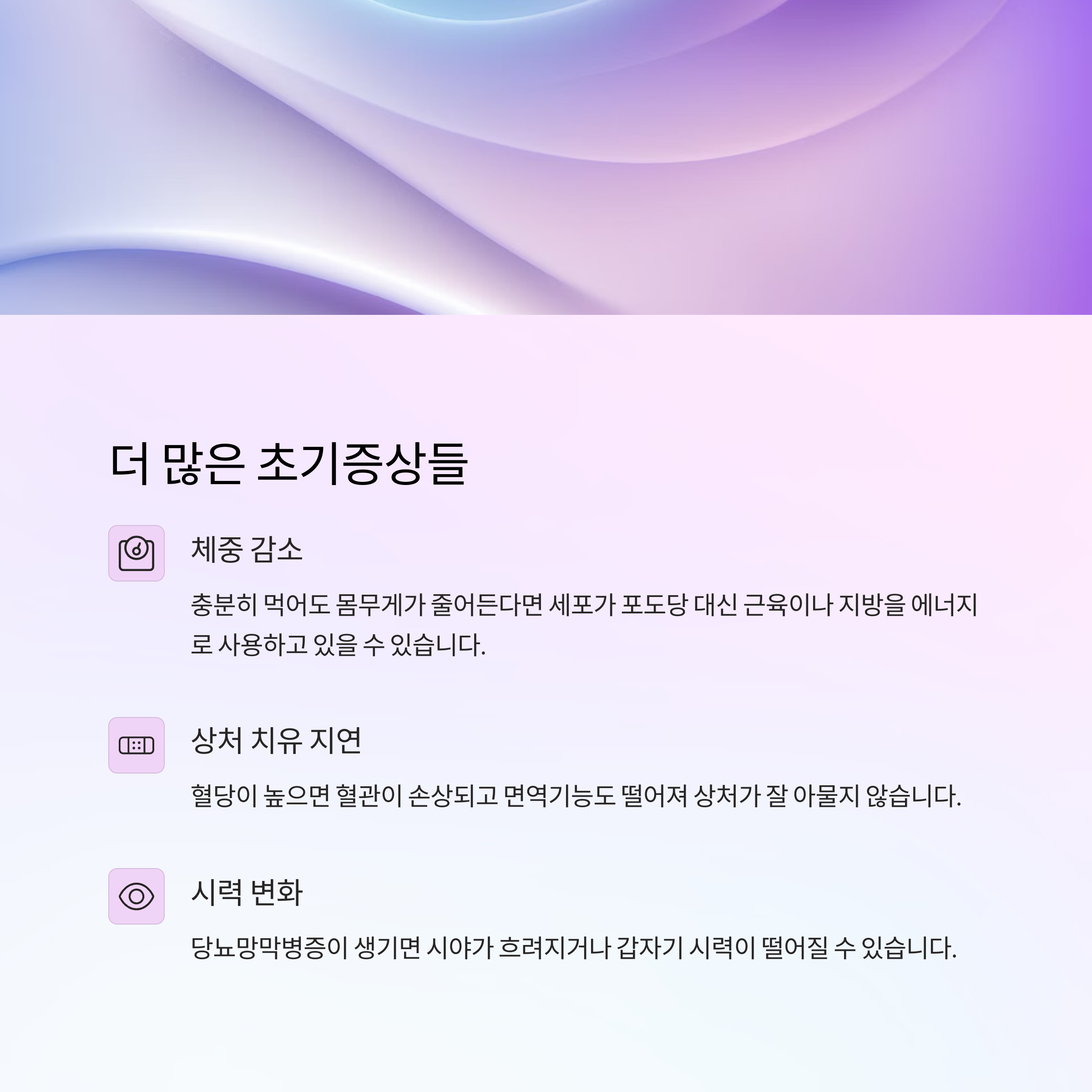 혈당이 높으면 혈관이 손상되고 면역기능도 떨어지기 때문에 상처나 염증이 쉽게 낫지 않아요. 작은 상처도 며칠씩 지속되면 주의가 필요해요.