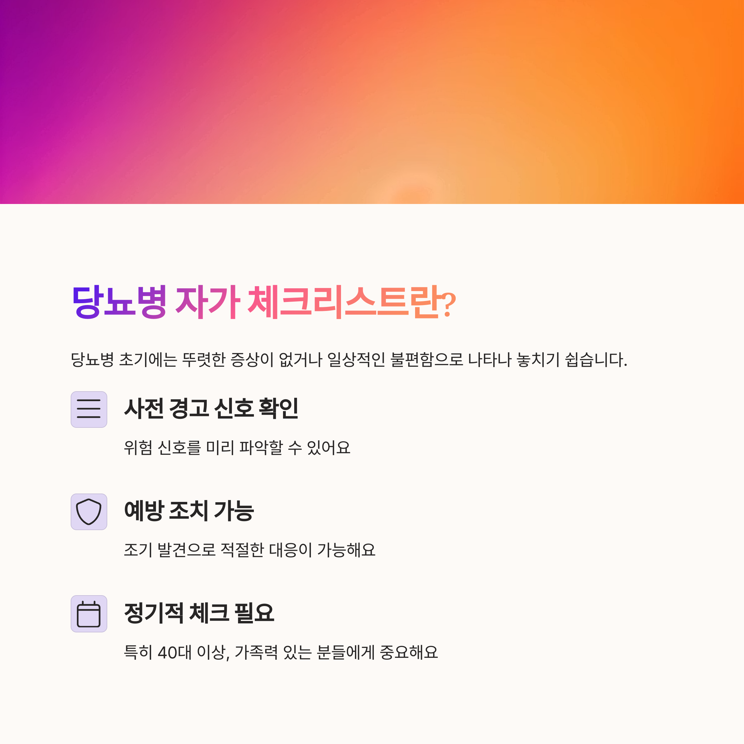 자가 체크리스트는 스스로 당뇨병의 위험 여부를 가늠해볼 수 있는 건강 문항이에요. 일반적으로 초기 당뇨병은 뚜렷한 증상이 없거나, 피로·소변·갈증 등 평소와 비슷한 증상으로 나타나기 때문에 놓치기 쉽죠.