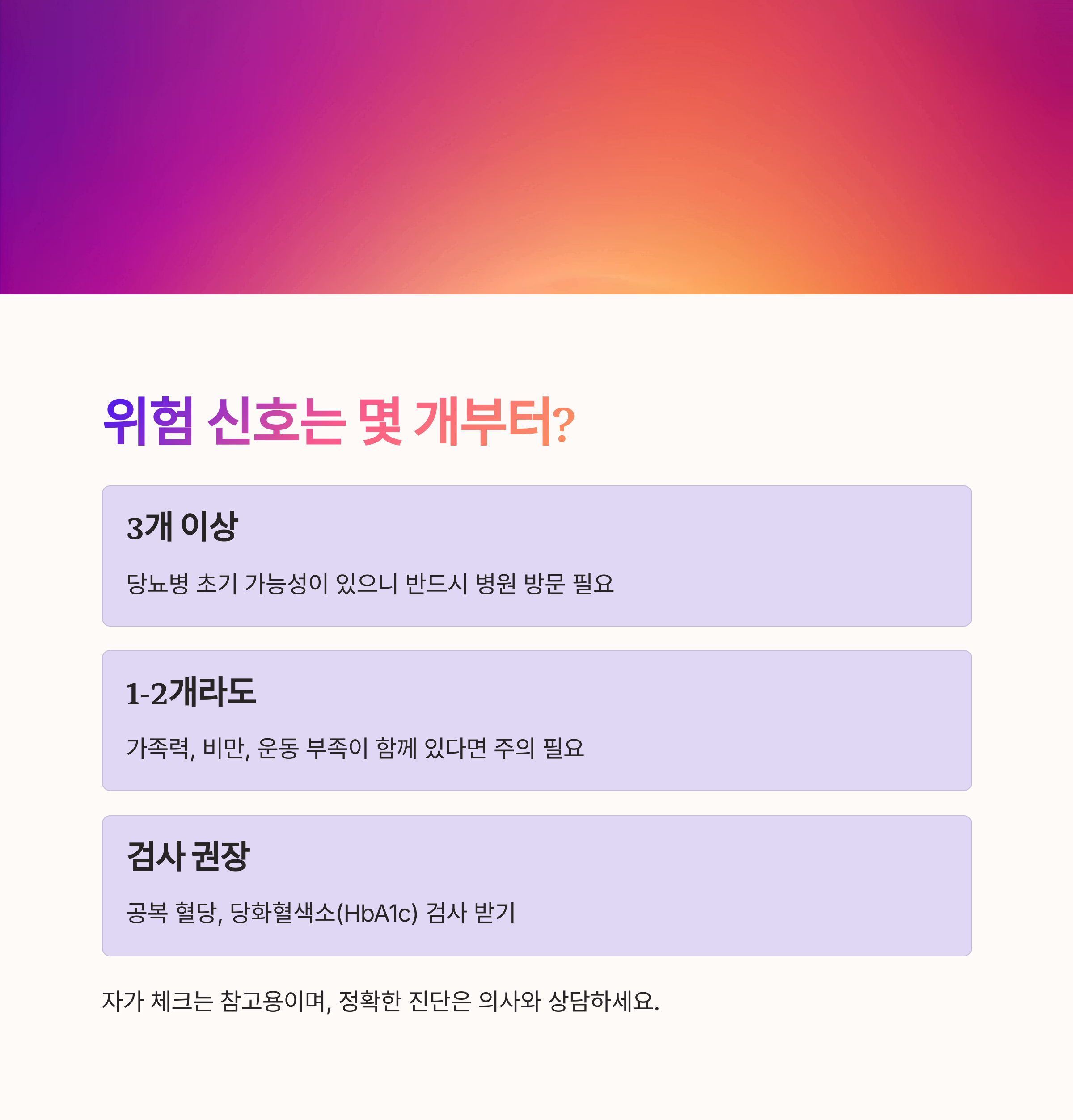 일반적으로 위 항목 중 3개 이상 해당된다면, 당뇨병 초기 가능성이 있으니 반드시 병원을 방문해 혈당 검사를 받아보는 게 좋아요.