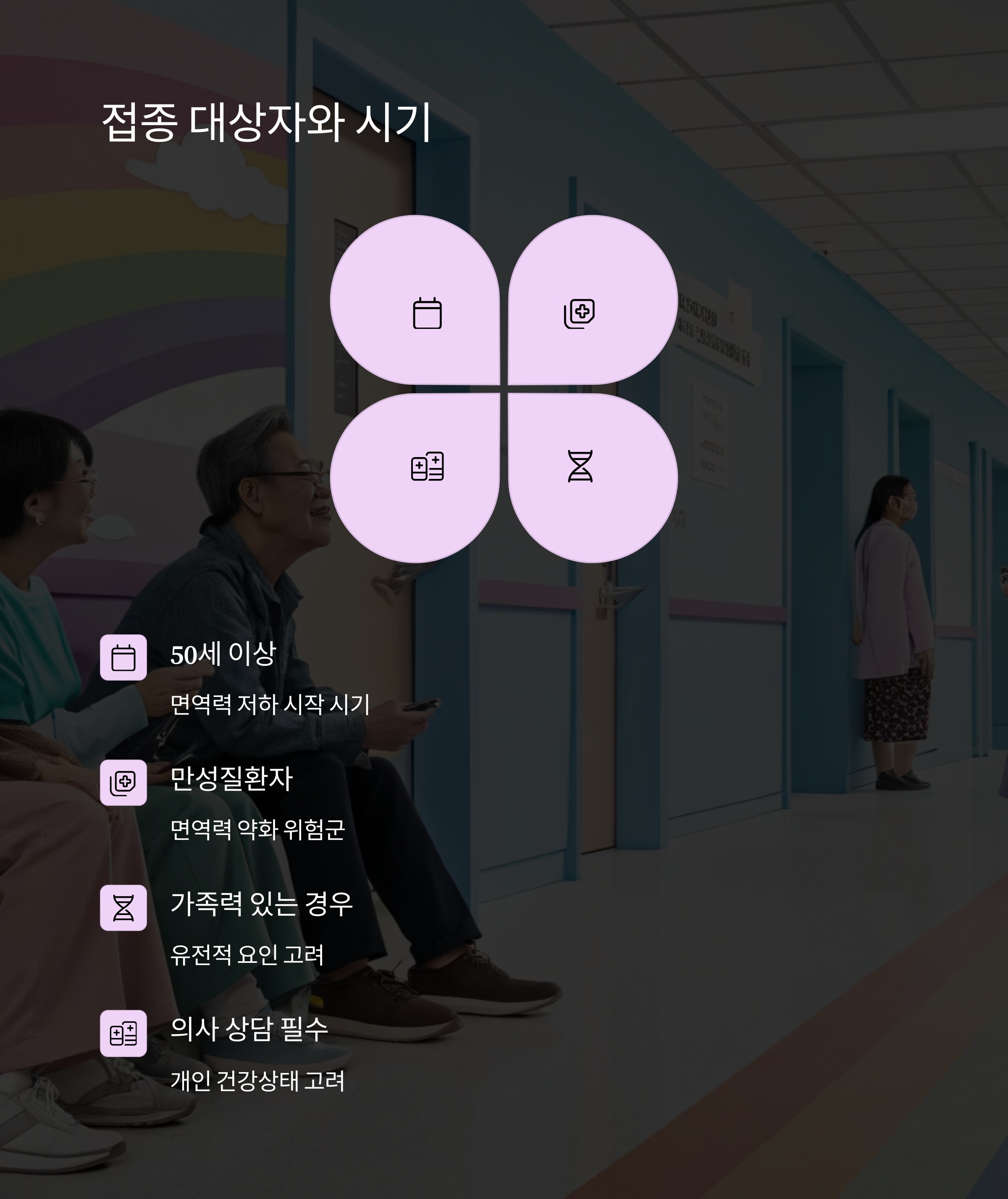 면역력은 나이가 들수록 자연스럽게 떨어지기 때문에 50세 이상이라면 의사의 상담을 통해 접종 여부를 결정하는 게 좋아요. 만성 질환이 있는 분들도 접종을 권장받는 경우가 많아요.