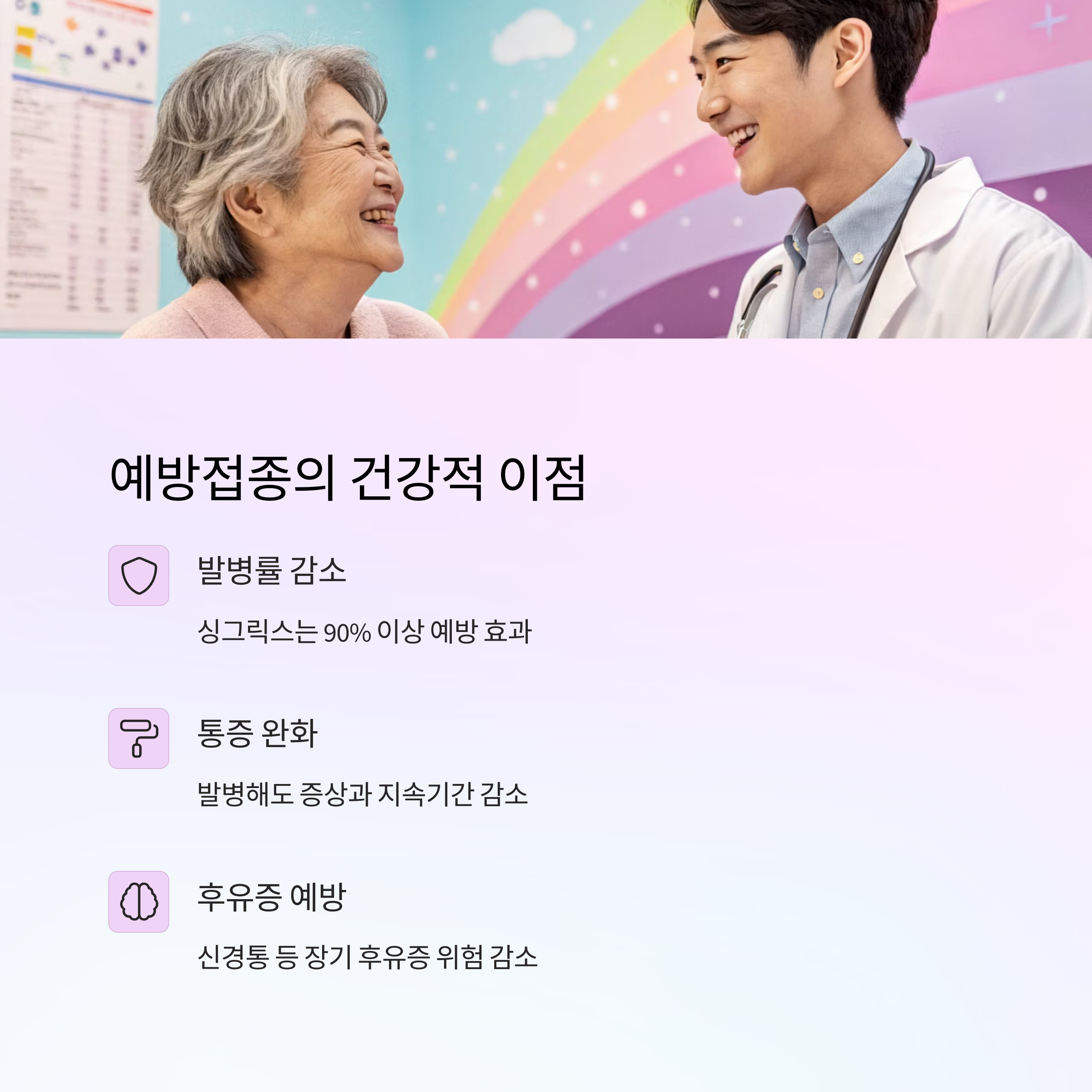 예방접종을 통해 대상포진 발병 자체를 크게 줄일 수 있고, 만약 발병하더라도 통증 강도와 지속 기간을 줄여줄 수 있어요. 특히 신경통으로 이어지는 후유증의 위험도 낮아진다는 것이 큰 장점이에요.